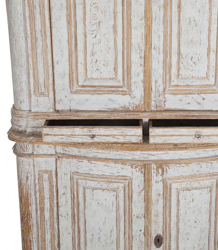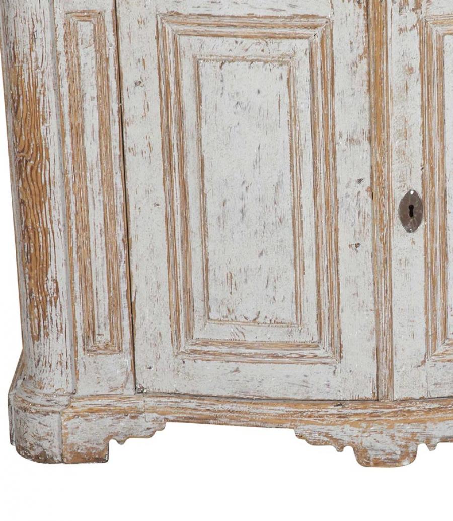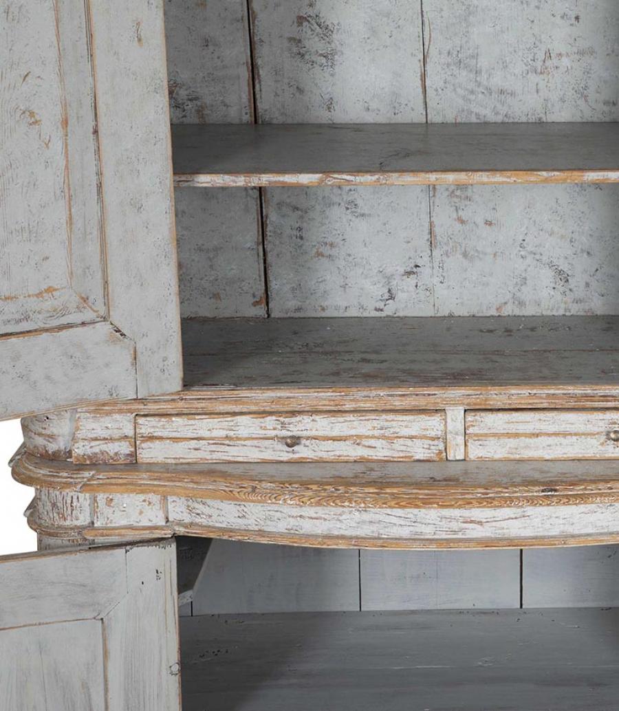 A period late 18th Century Swedish Rococo cabinet. With decorative deep carved pediment. With carved detailing to the doors opening to storage, below a bow fronted base, with two further doors opening to further storage. Repainted in soft grey. Circa 1780.