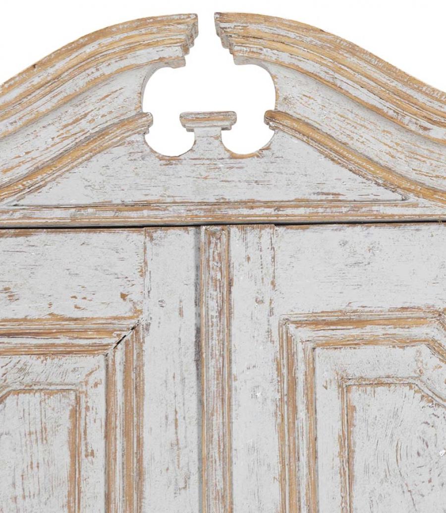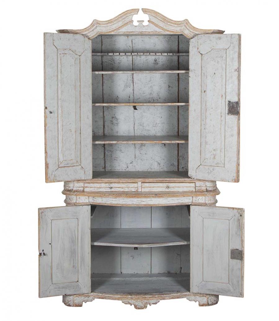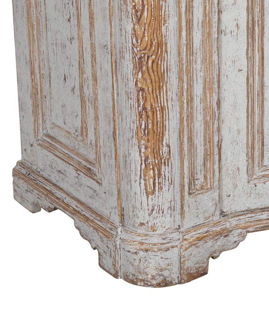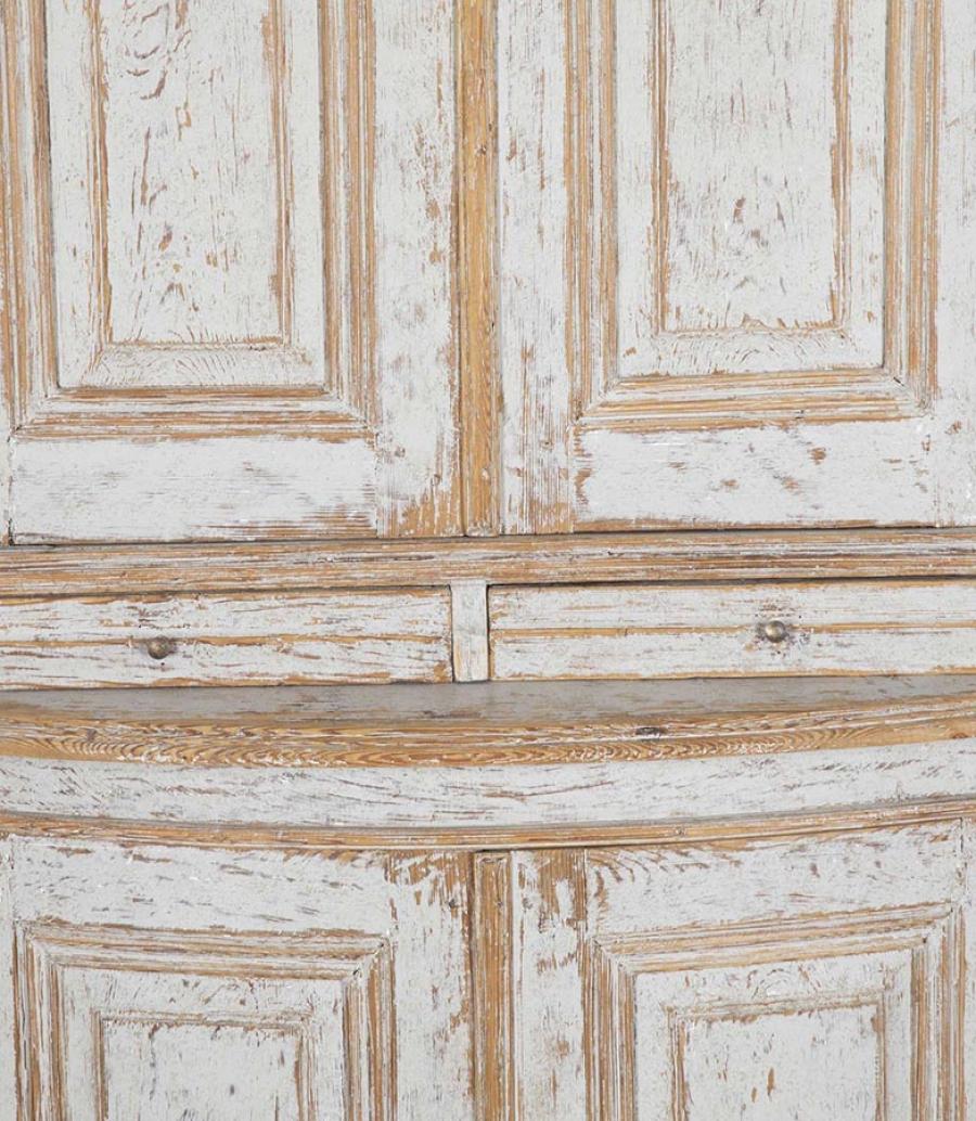 A period late 18th Century Swedish Rococo cabinet. With decorative deep carved pediment. With carved detailing to the doors opening to storage, below a bow fronted base, with two further doors opening to further storage. Repainted in soft grey. Circa 1780.