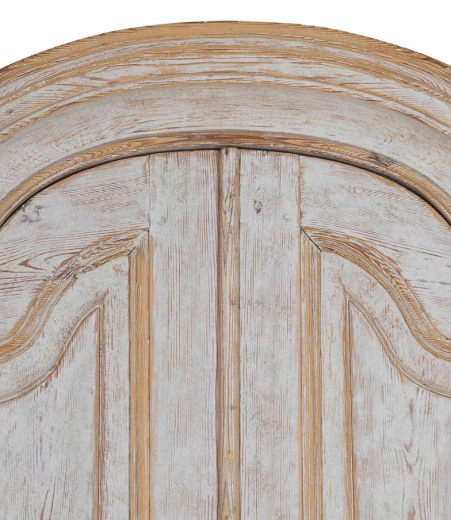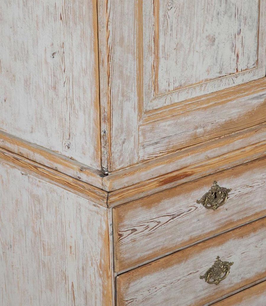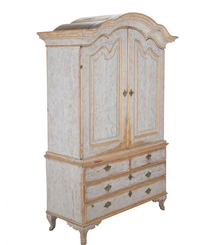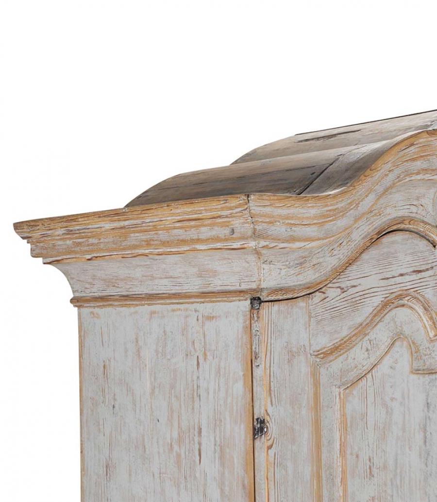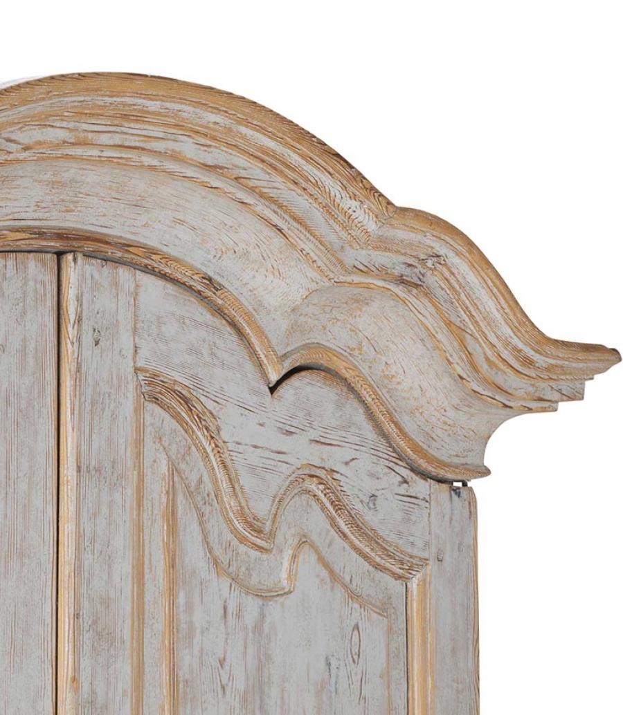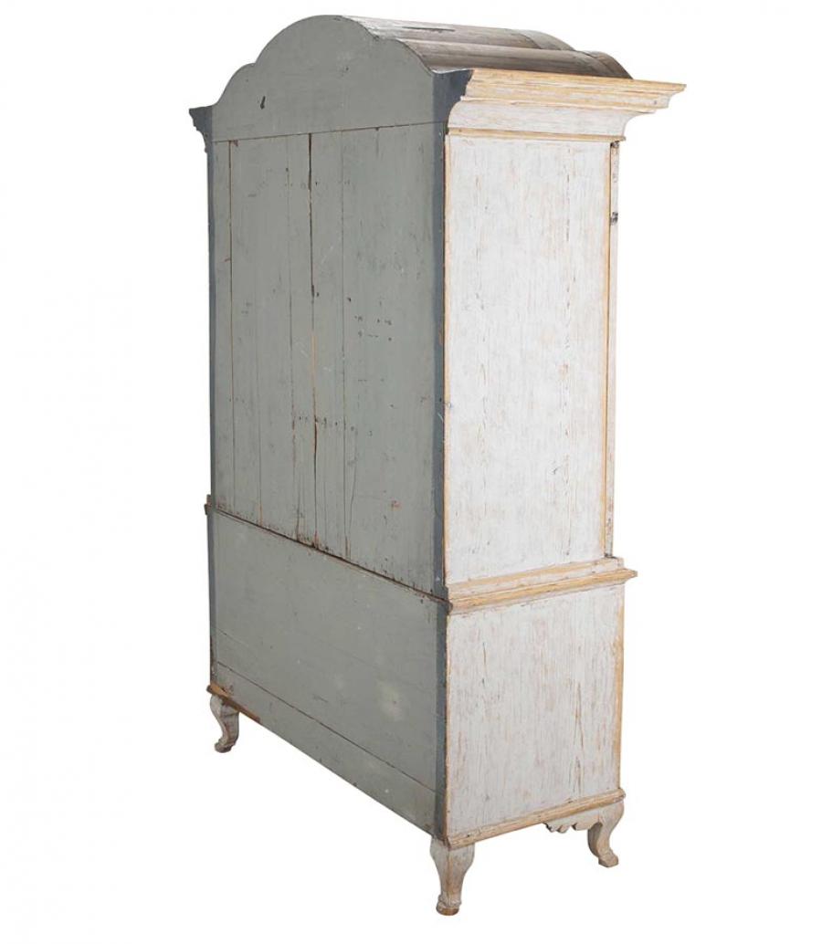 A period 18th Century Swedish Rococo cabinet. With decorative carved pediment, below two carved doors opening to storage, further below two short and two long drawers. With original hardware, repainted in soft grey with plate blue interior. Circa 1770.