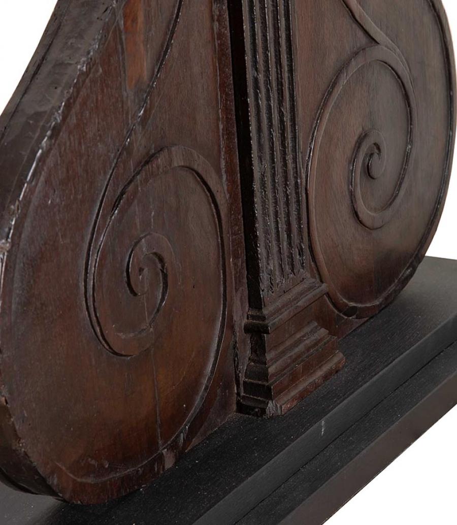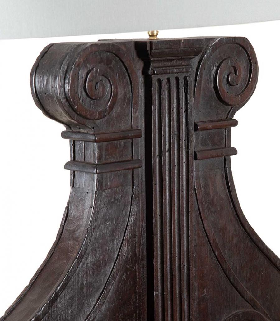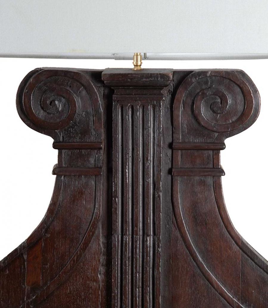 Large pair of 19th Century Italian carved wooden lamps made from architectural walnut fragments.