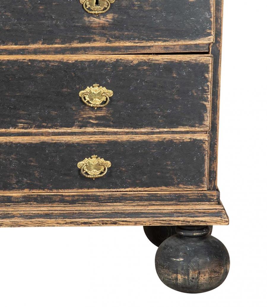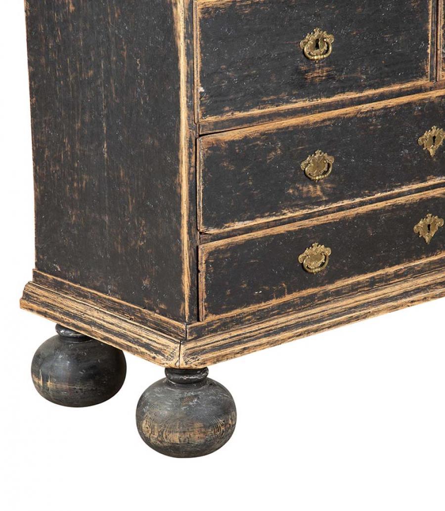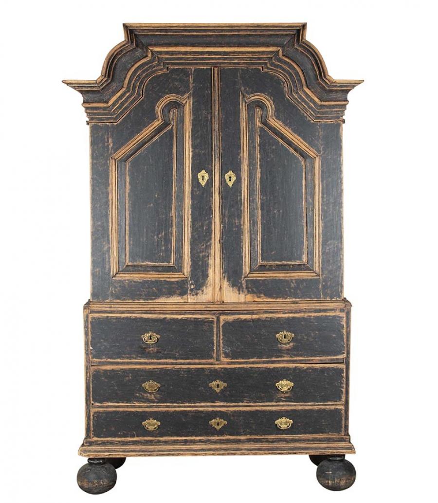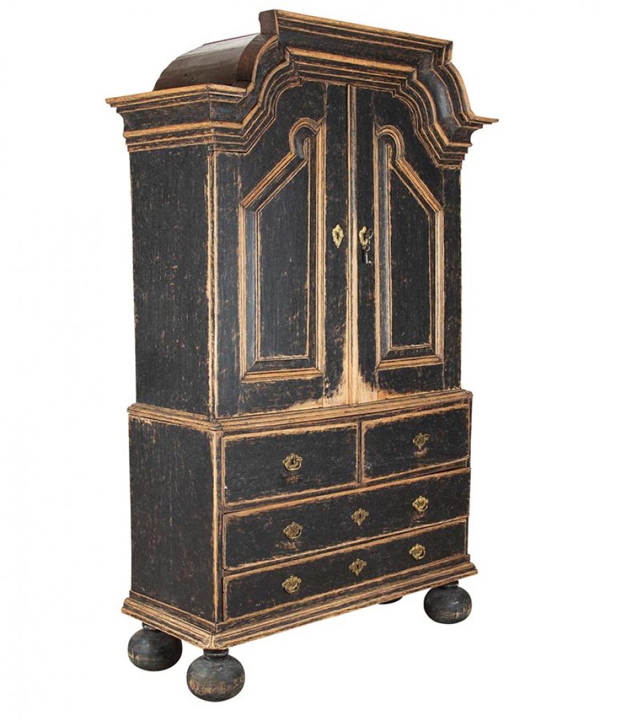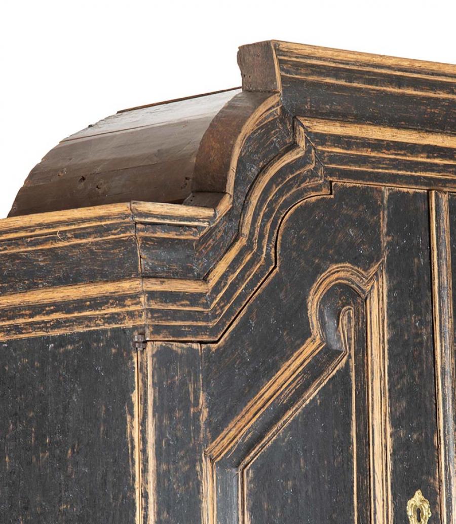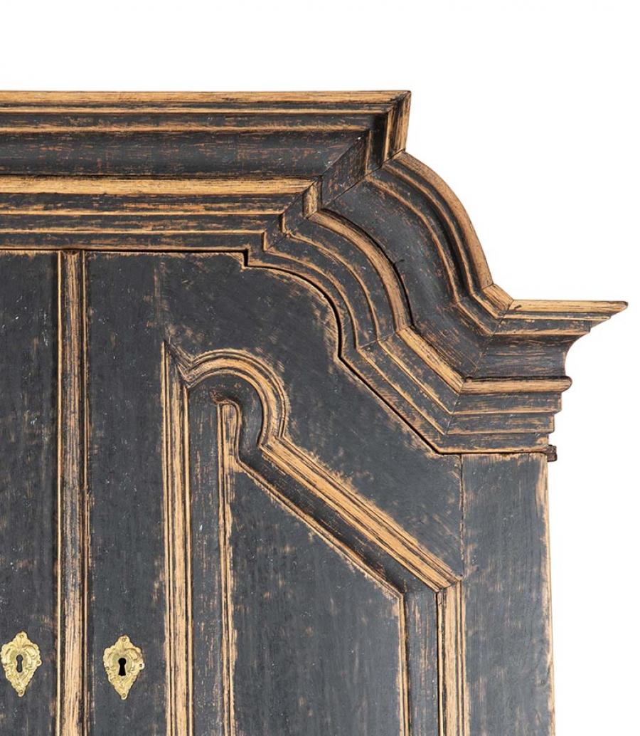 Late 18th Century Swedish Rococo cabinet with unusual carved pediment. Featuring two carved doors opening to useful storage, as well as further storage at the bottom, featuring two short and two long drawers. Repainted in soft black with its original hardware. Circa 1780. This item is currently in storage and therefore we need 3 working days notice for viewings. Please contact us before travelling to view this item.