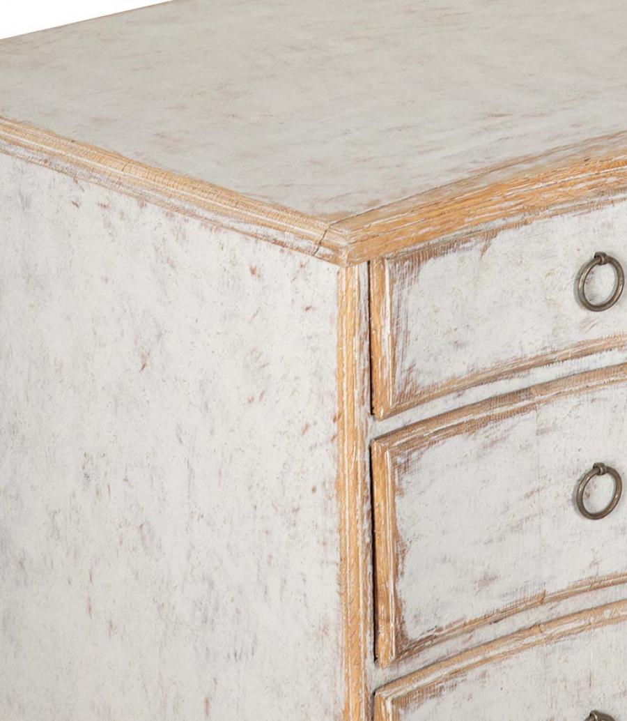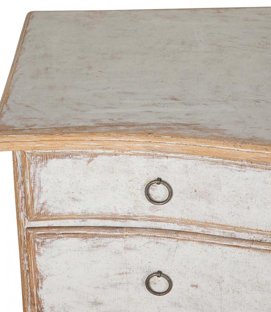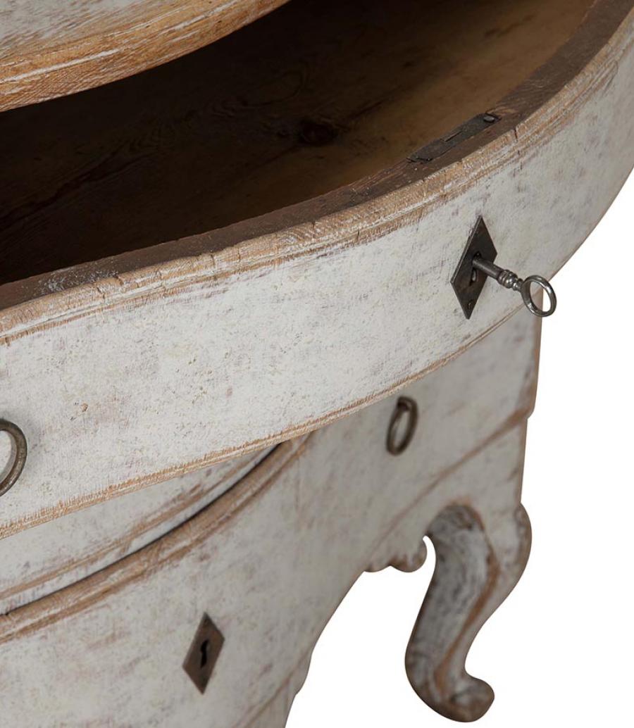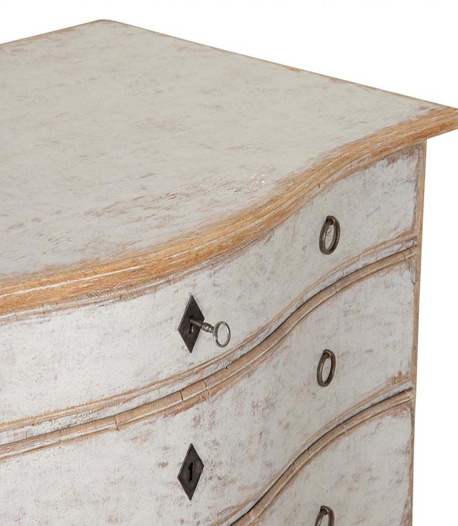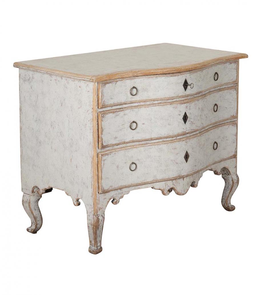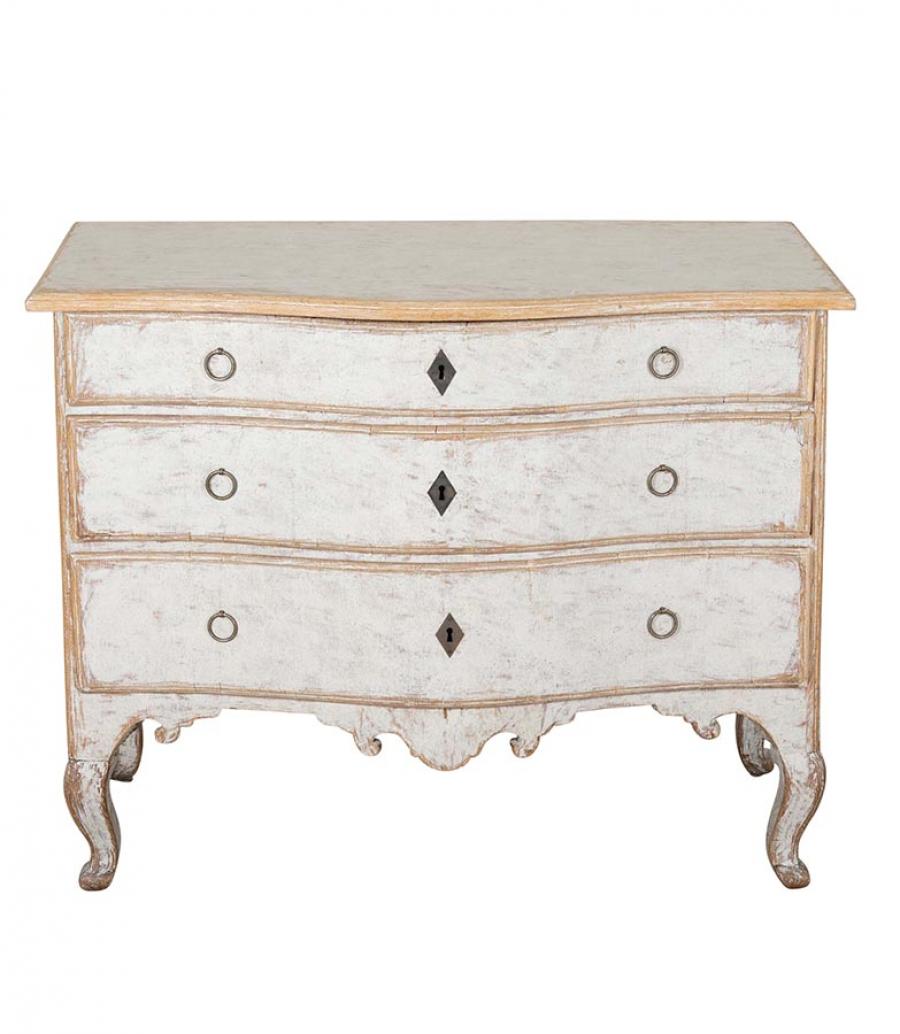 18th Century Swedish Rococo serpentine front commode with three drawers, below tapering to a decorative carved apron and cabriolet legs.