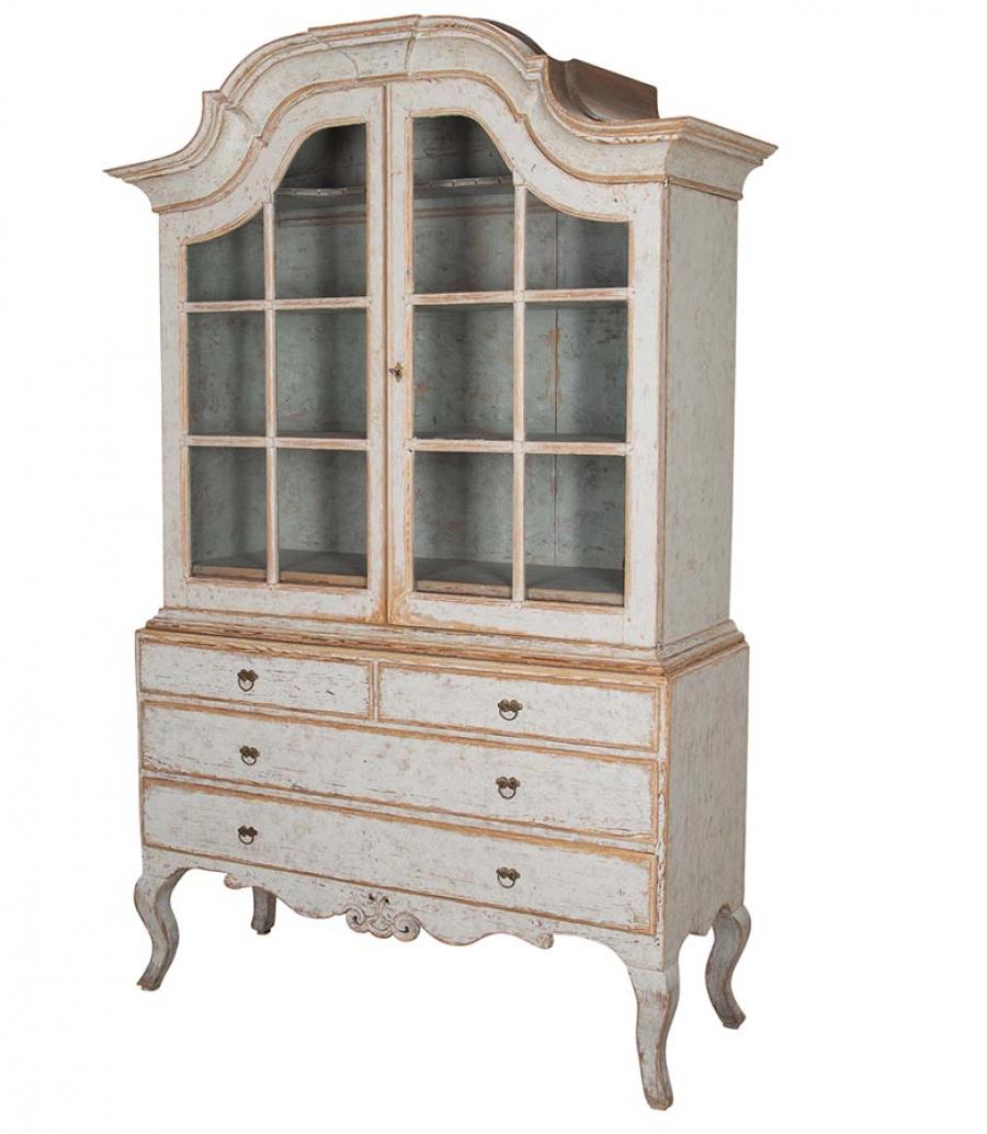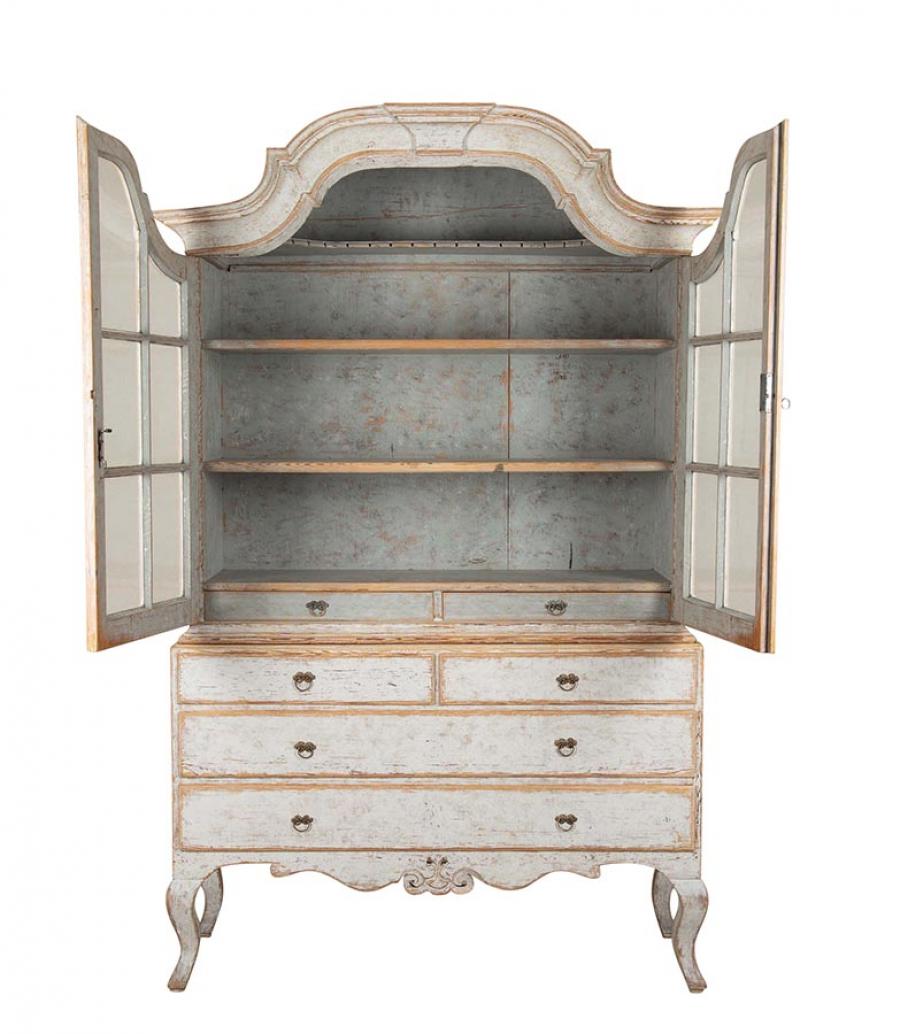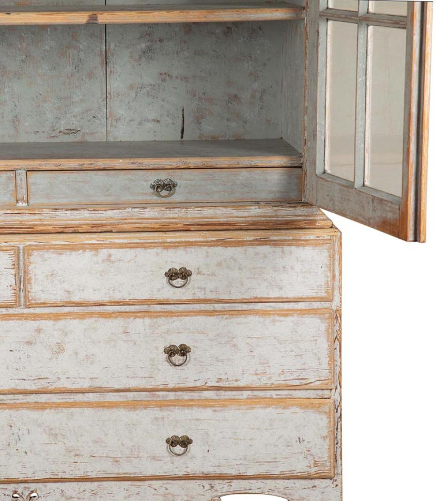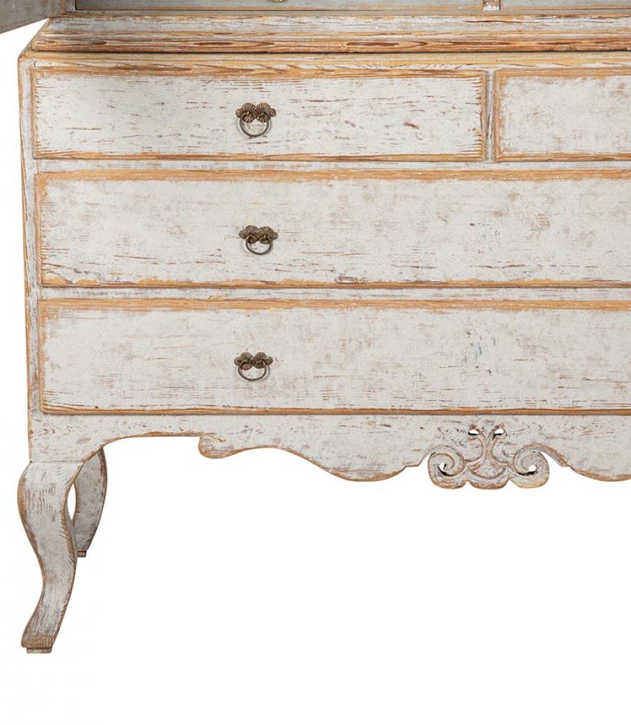 Exceptional late 18th Century Swedish Rococo vitrine. With crisp carving and good construction and proportions. With a decorative carved pediment, two glazed doors opening to storage. Below, two short and two long drawers. Repainted in soft grey outside and blue on the inner and the original hardware. Circa 1780.