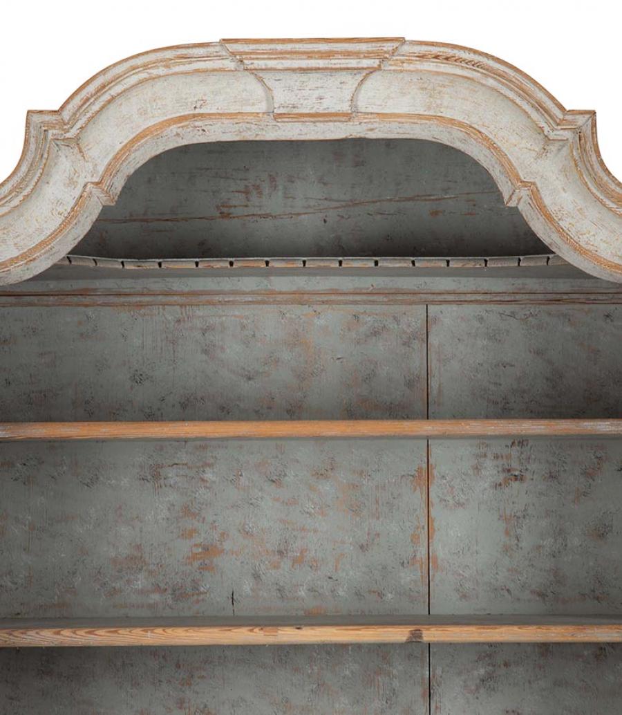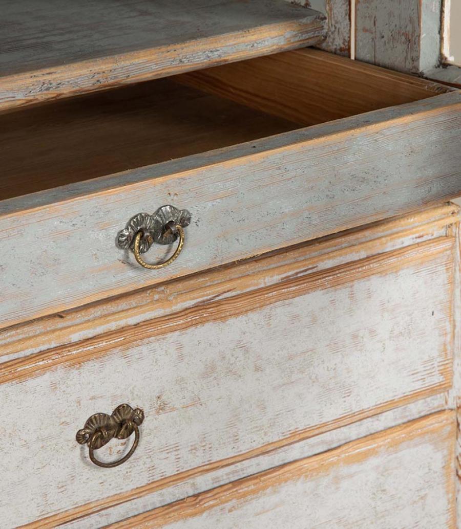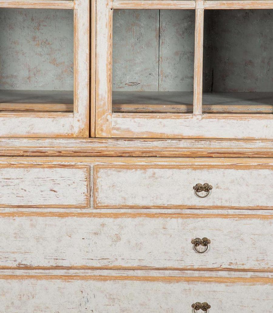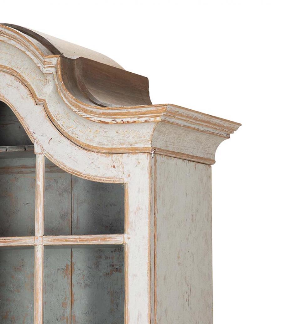 Exceptional late 18th Century Swedish Rococo vitrine. With crisp carving and good construction and proportions. With a decorative carved pediment, two glazed doors opening to storage. Below, two short and two long drawers. Repainted in soft grey outside and blue on the inner and the original hardware. Circa 1780.
