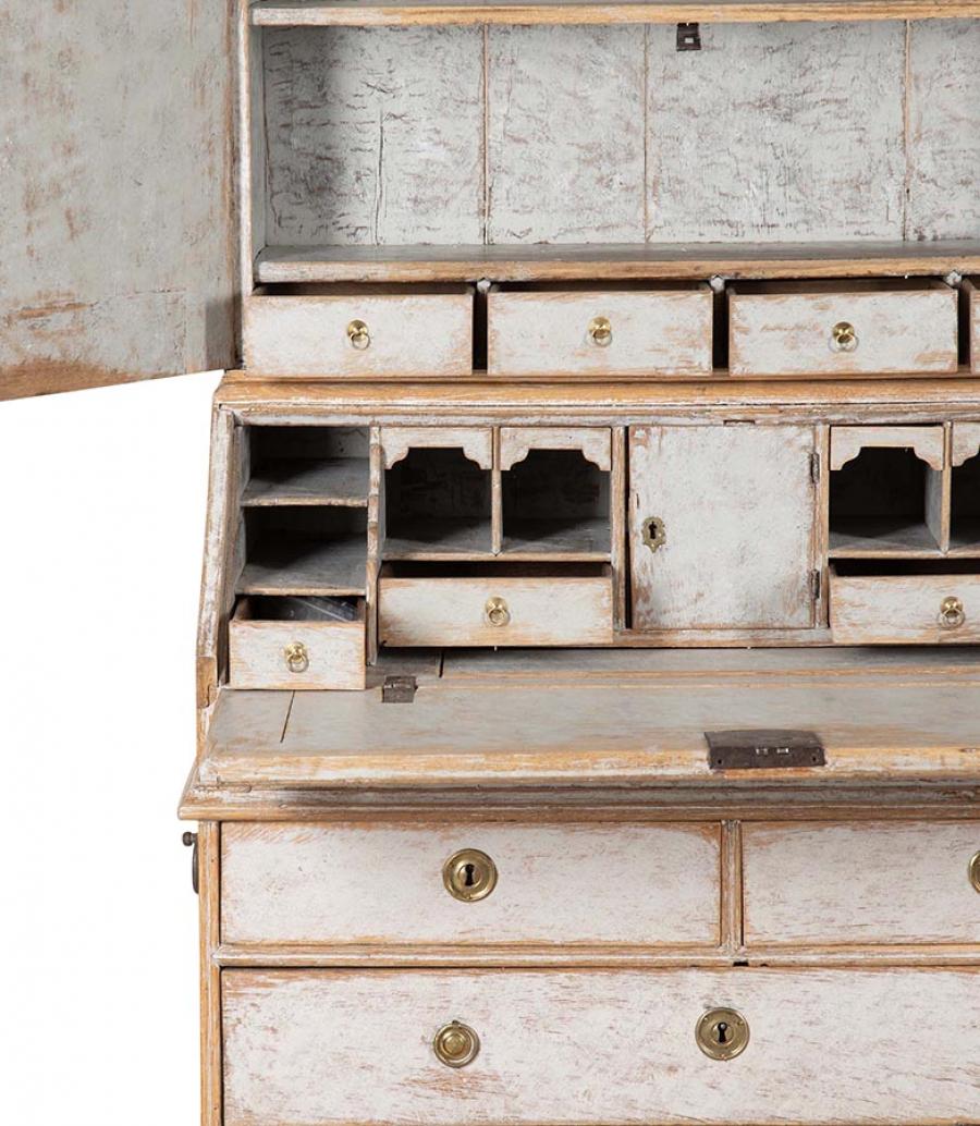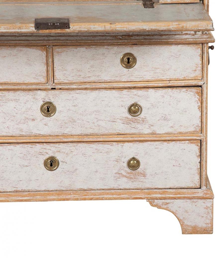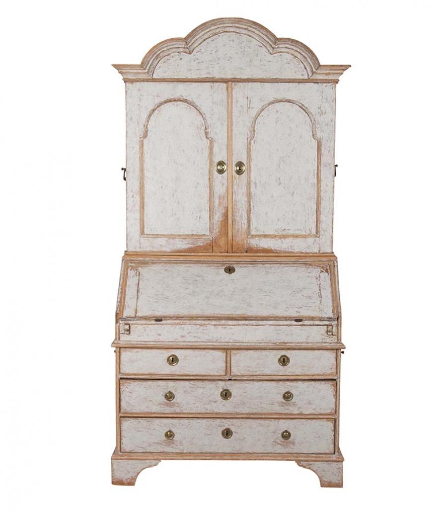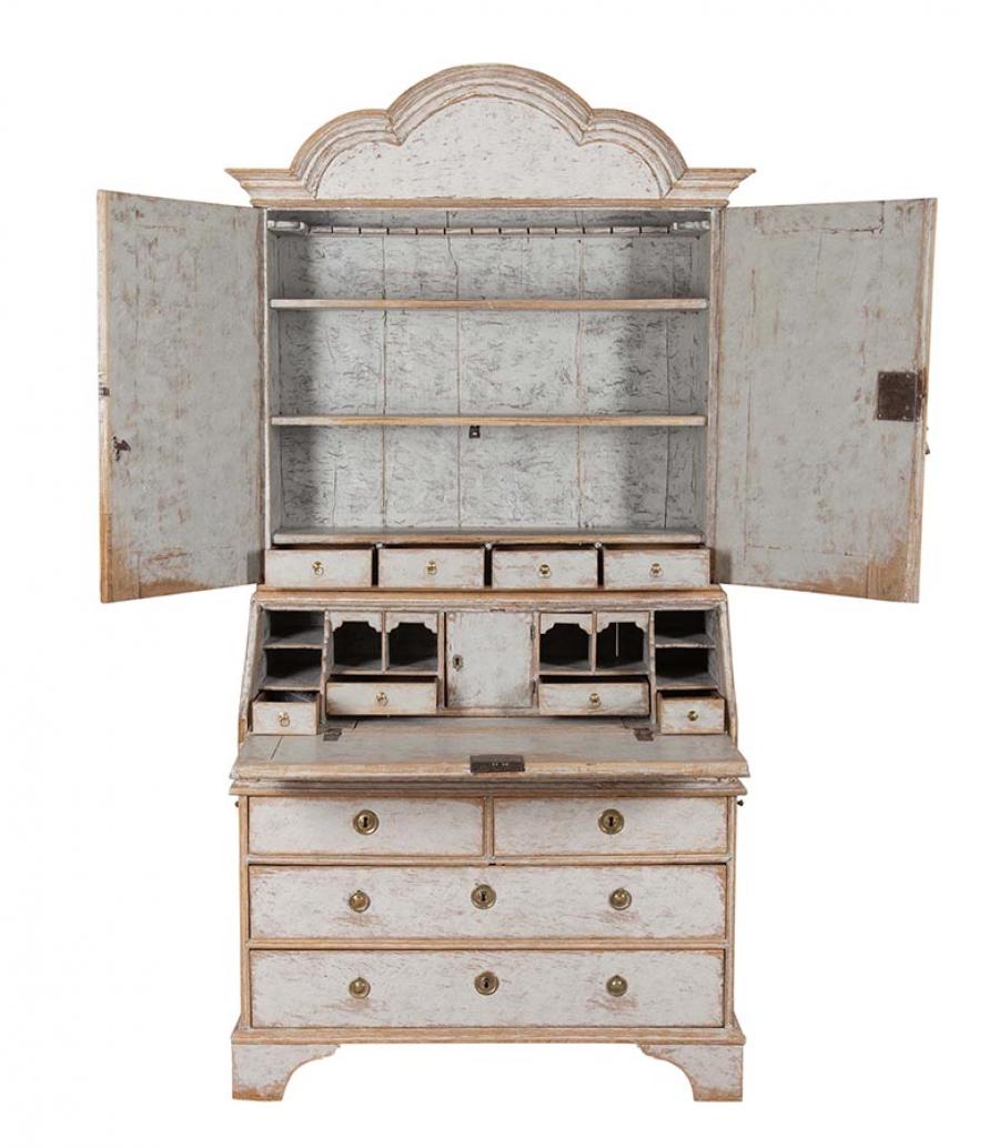 18th Century Swedish Rococo secretary. With decorative carved and curved pediment. Below, two doors opening to storage and a fall front desk opening to pigeon holes and drawers. With two short and two long drawers. Repainted in soft grey and with the original hardware. Circa 1760.