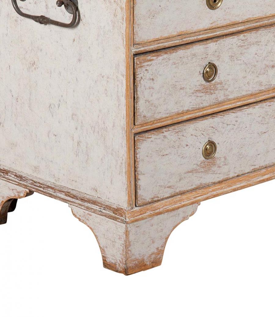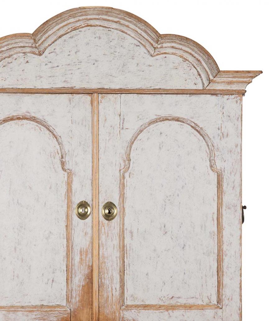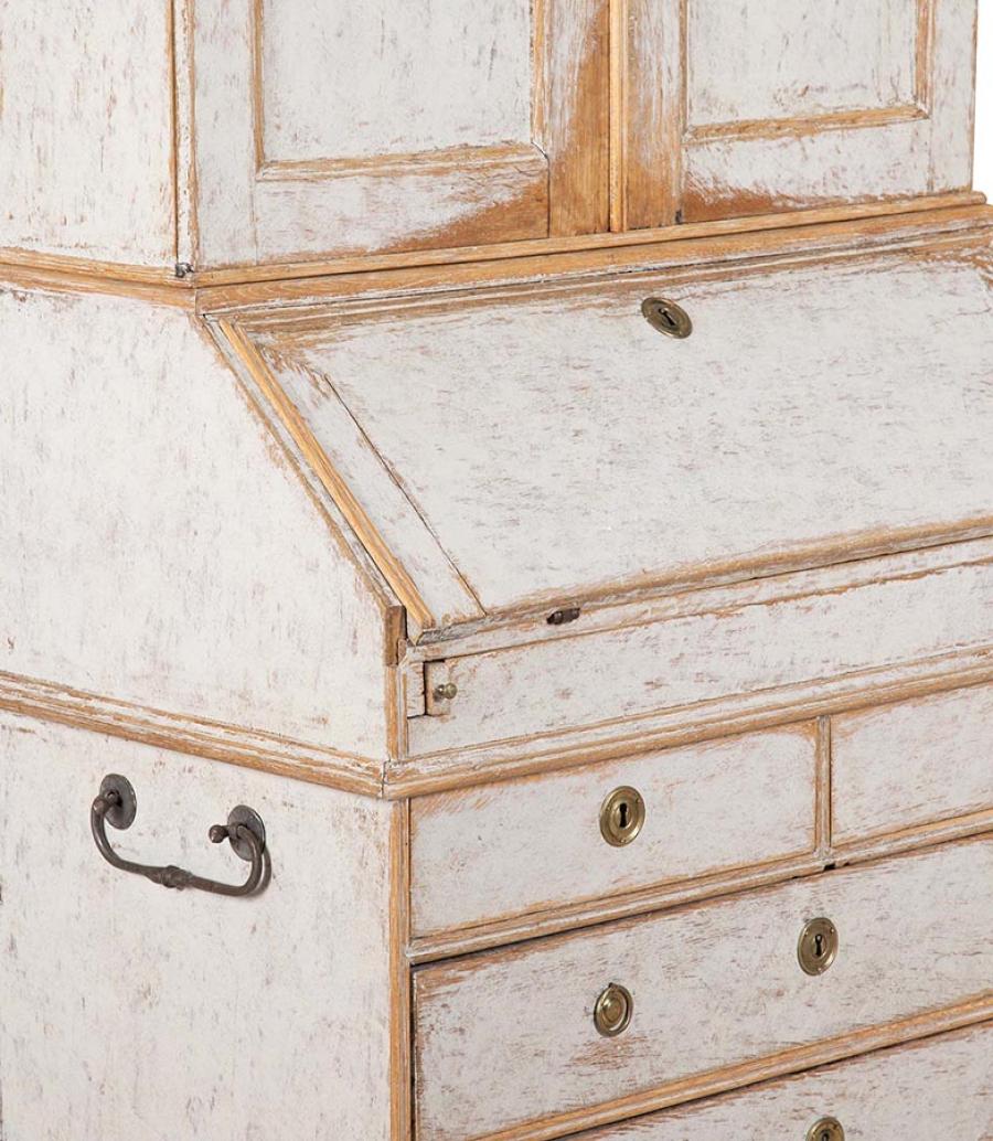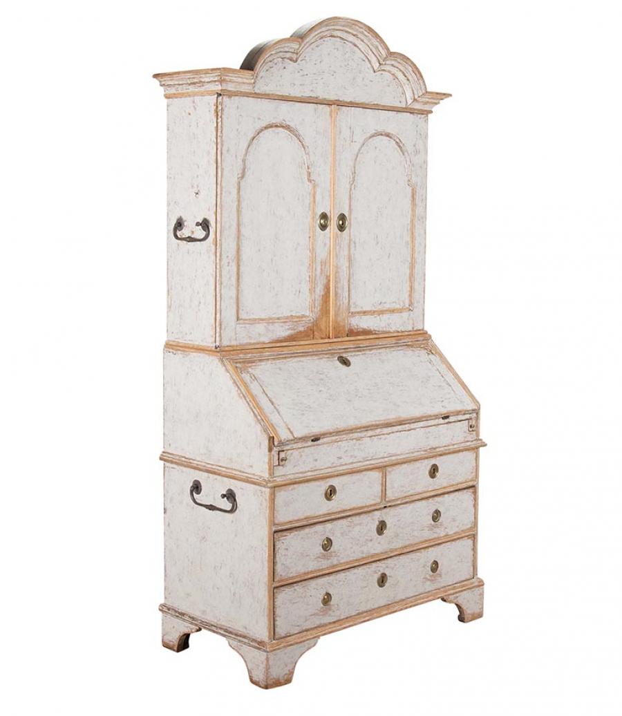 18th Century Swedish Rococo secretary. With decorative carved and curved pediment. Below, two doors opening to storage and a fall front desk opening to pigeon holes and drawers. With two short and two long drawers. Repainted in soft grey and with the original hardware. Circa 1760.