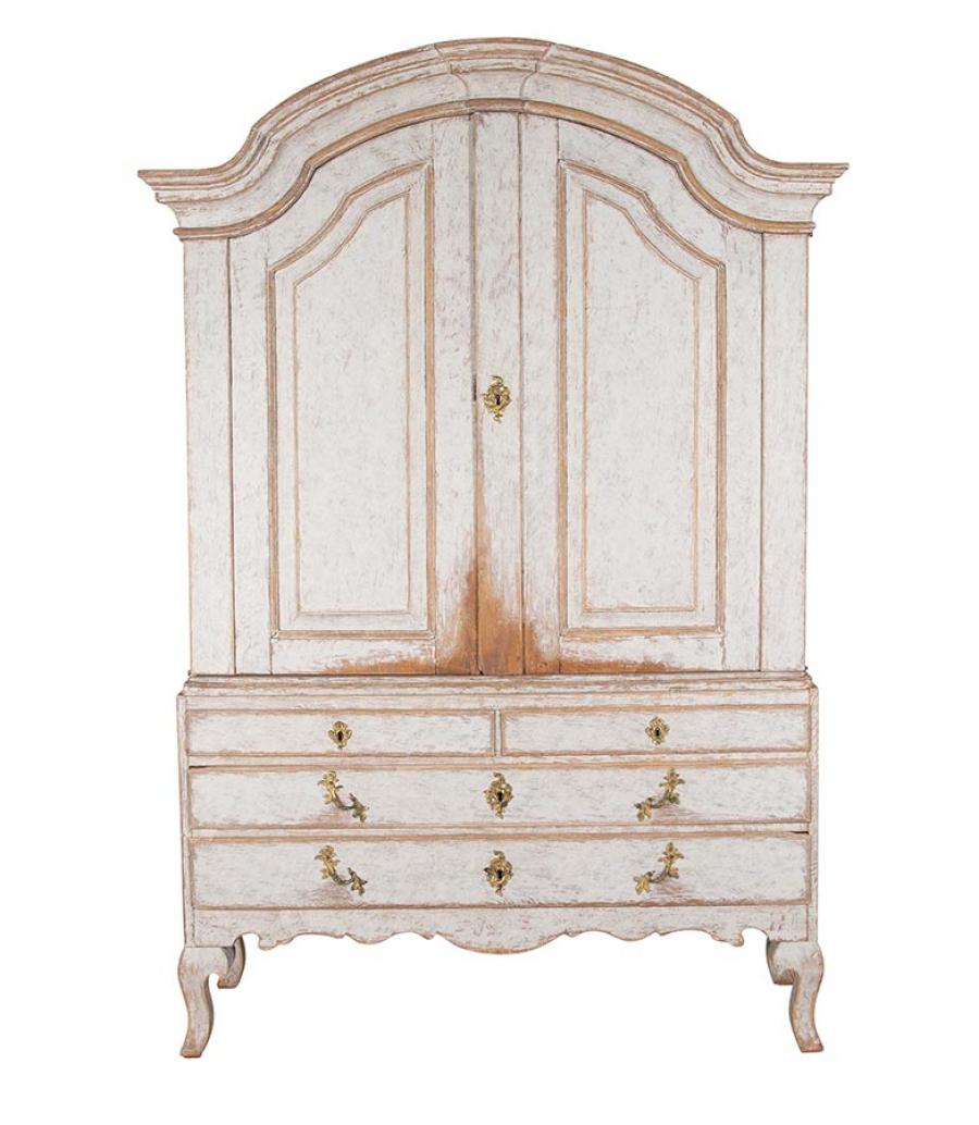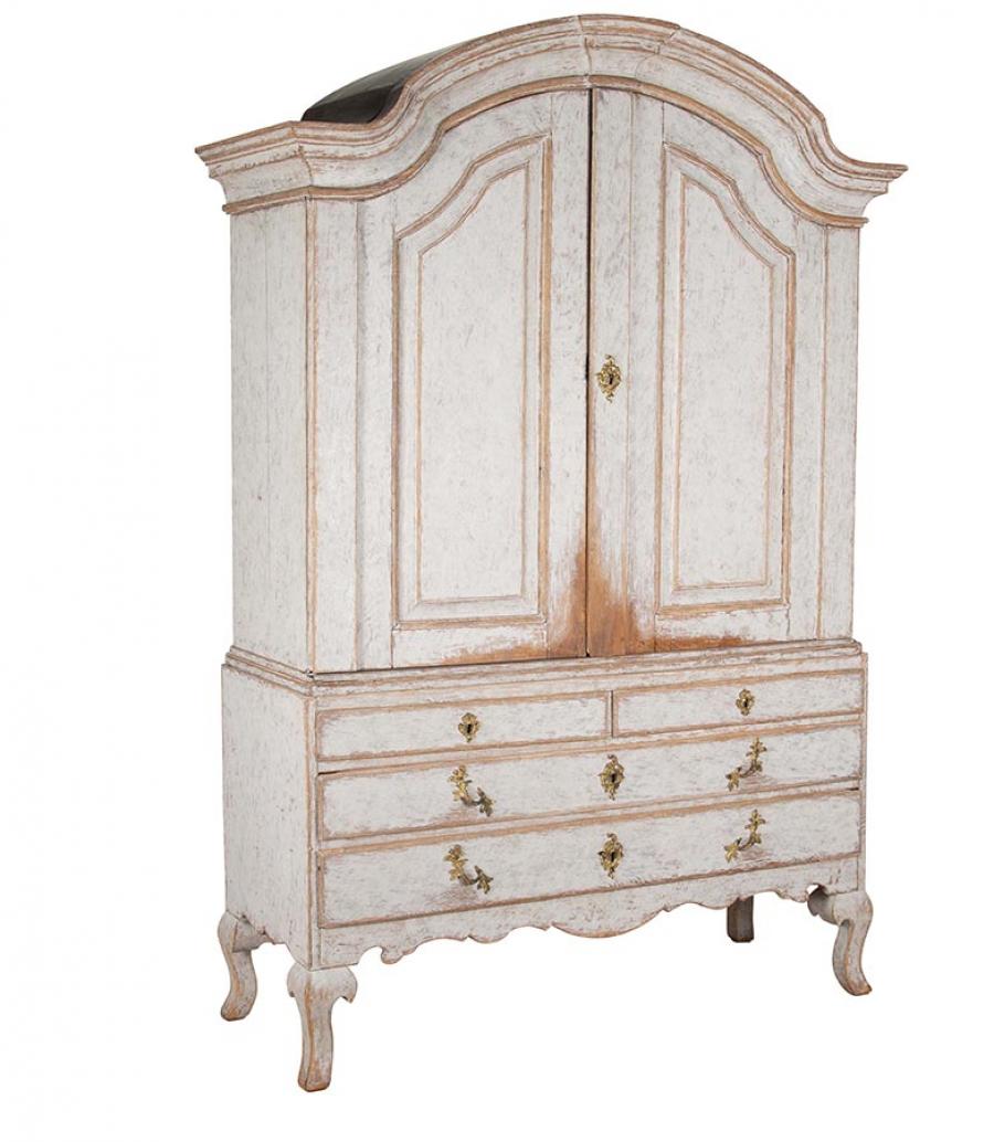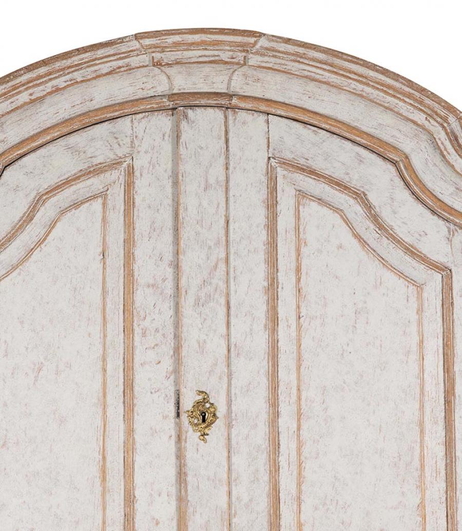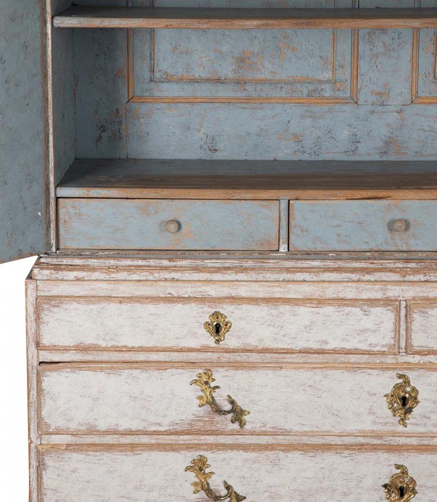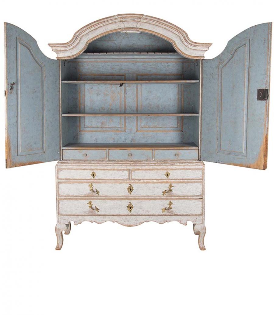 An impressive period Swedish Rococo cabinet. With an arched top and below, two carved doors opening to storage. Further below, two shot and three long drawers. With original locks and hardware. Repainted in soft grey with a blue interior. Circa 1760. Breaks down to five pieces for ease of transportation and assembly.