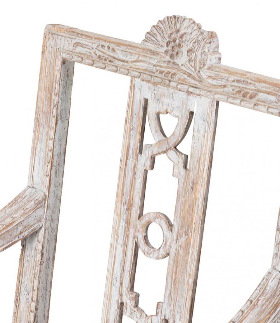 Crisp deep carving, re-painted in soft grey and re-upholstered in linen. Circa 1790.
