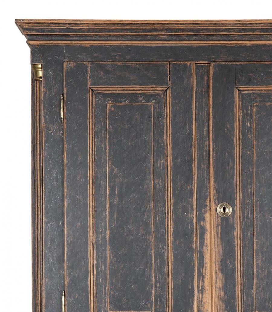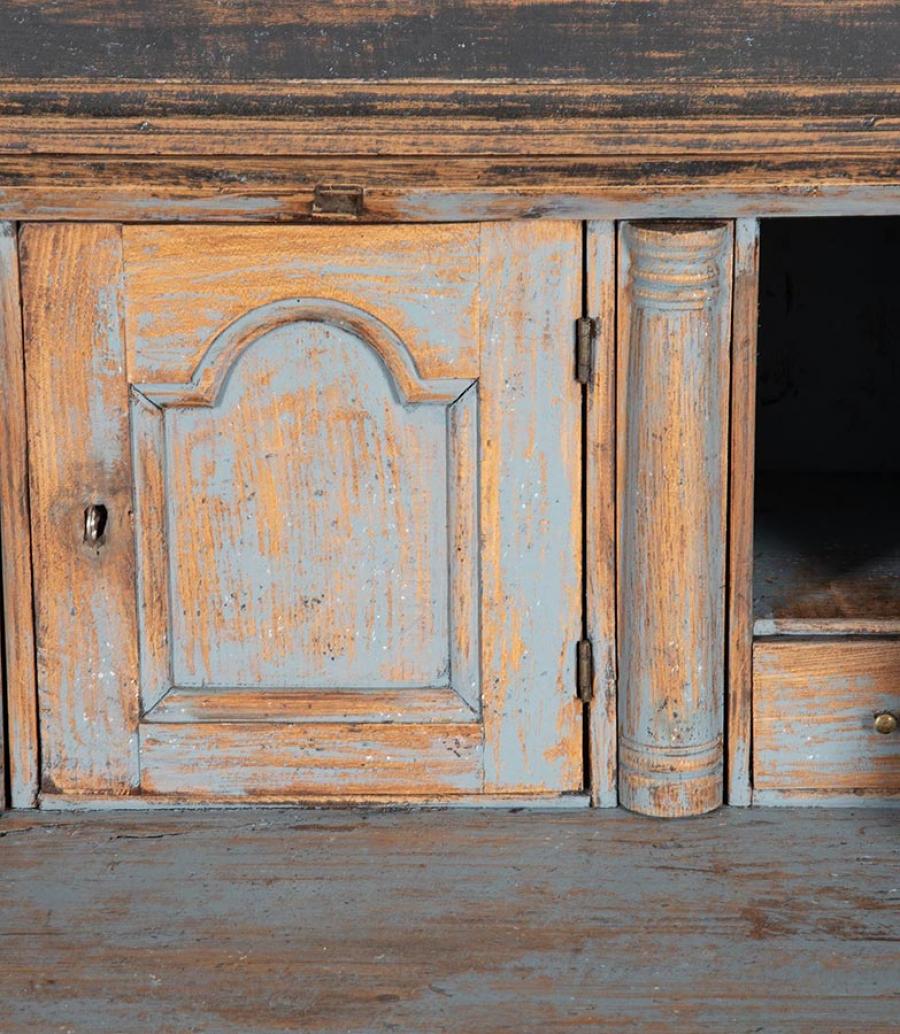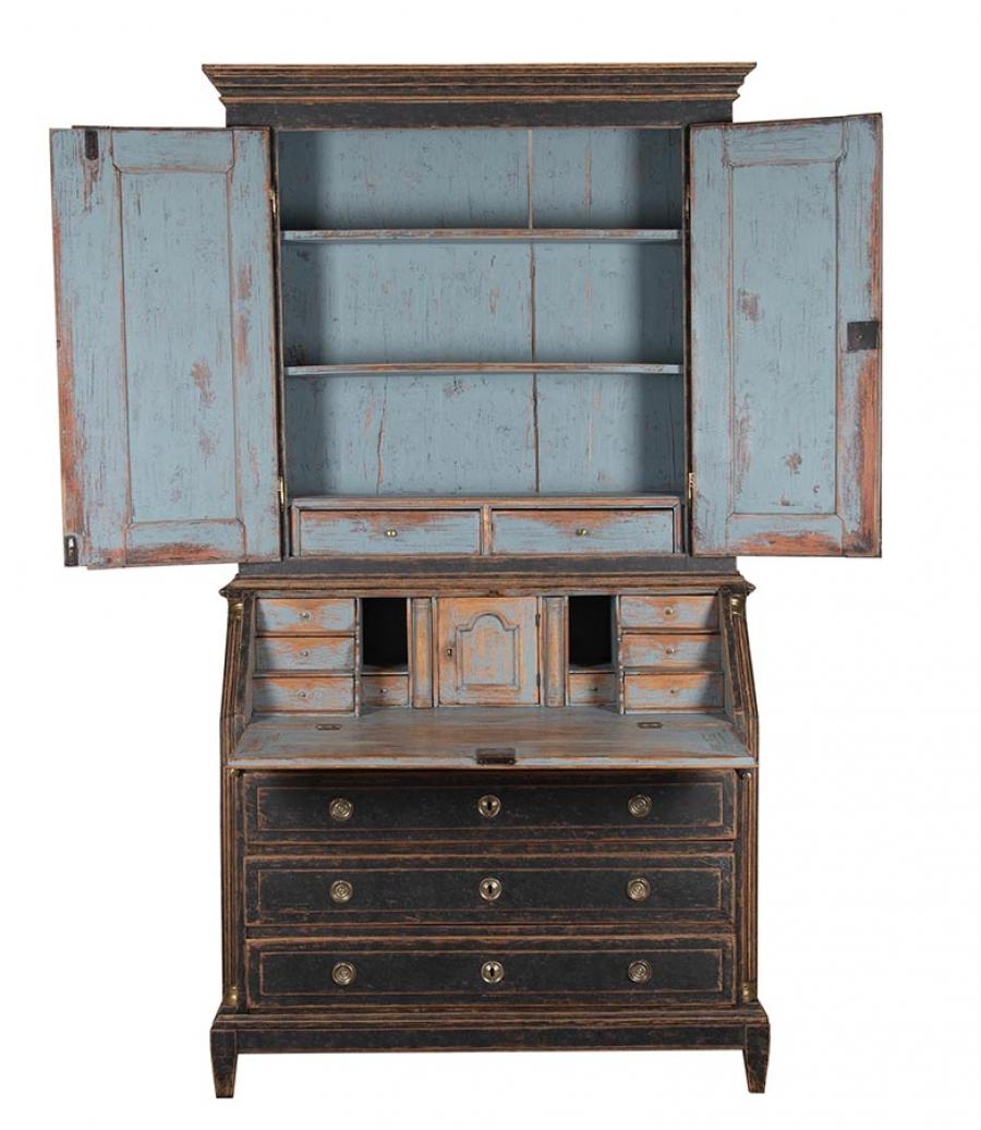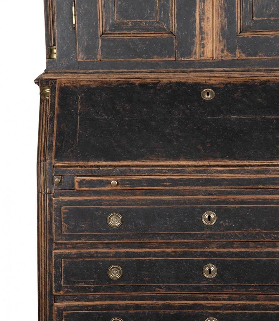 Period late 18th Century Danish secretary. Carved wooden doors opening to storage, below a fall front desk with useful work space and multiple drawer storage. Further below, three drawers. Repainted in soft black with a blue interior. Circa 1780.