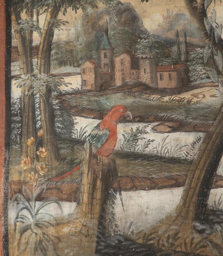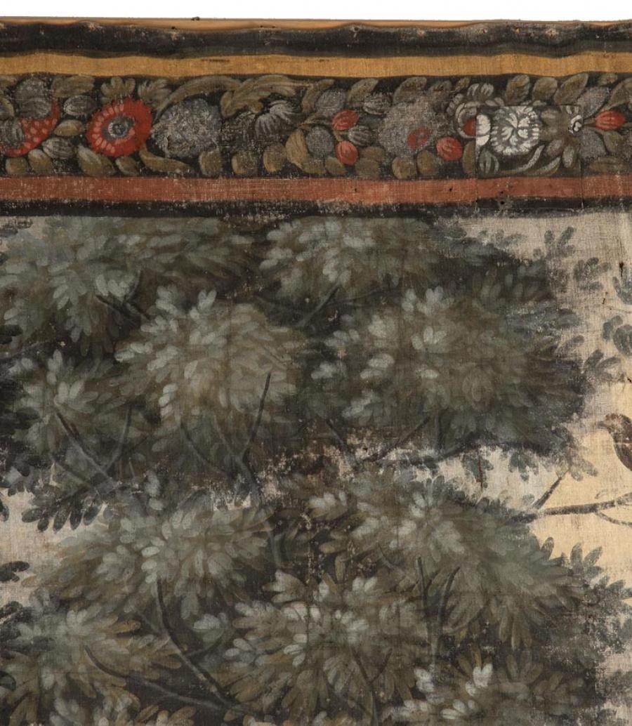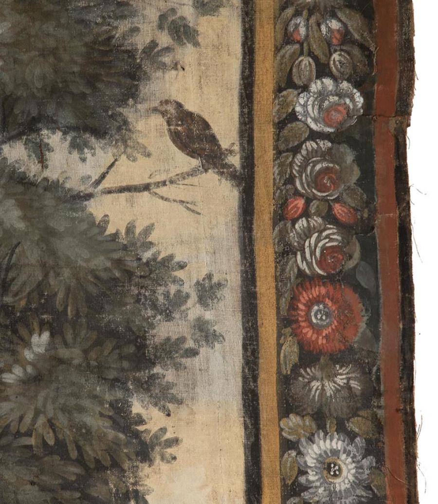 Exceptional late 18th Century French canvas. Painted on linen with egg tempura of three birds in the grounds of a chateau forest. A true decorator's piece.