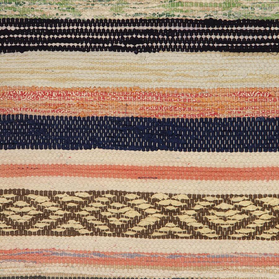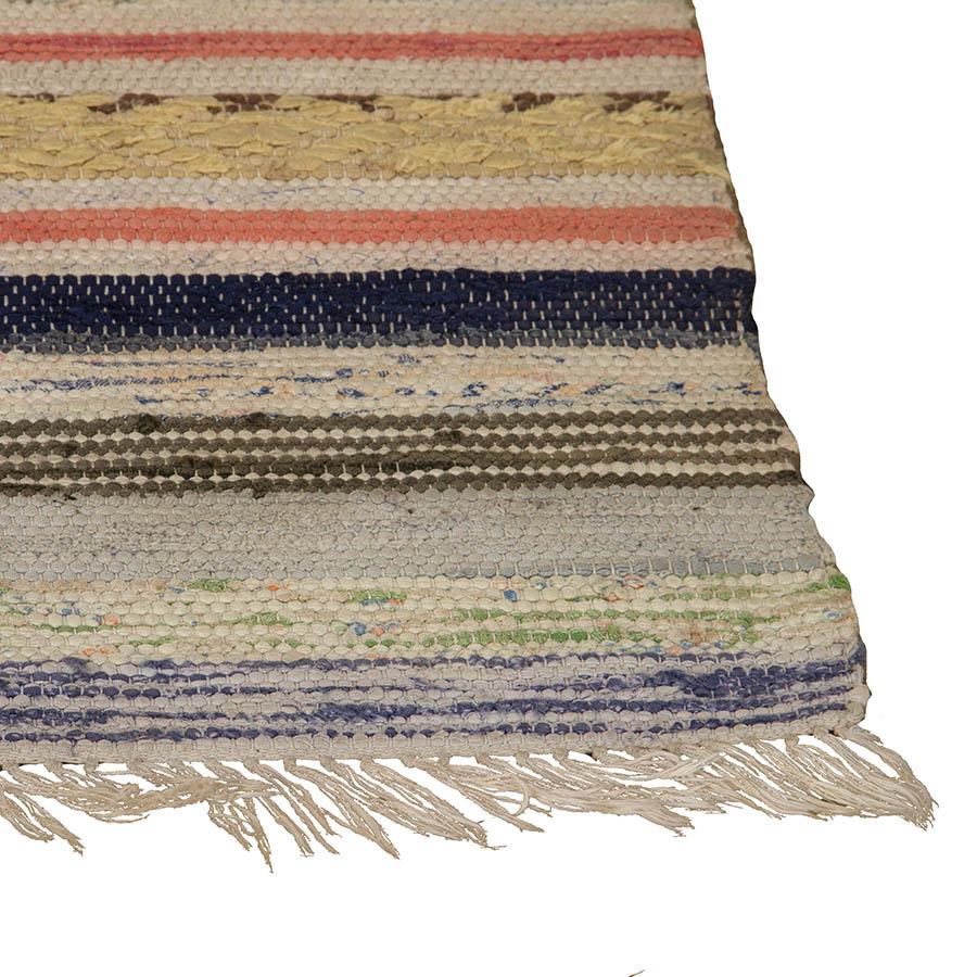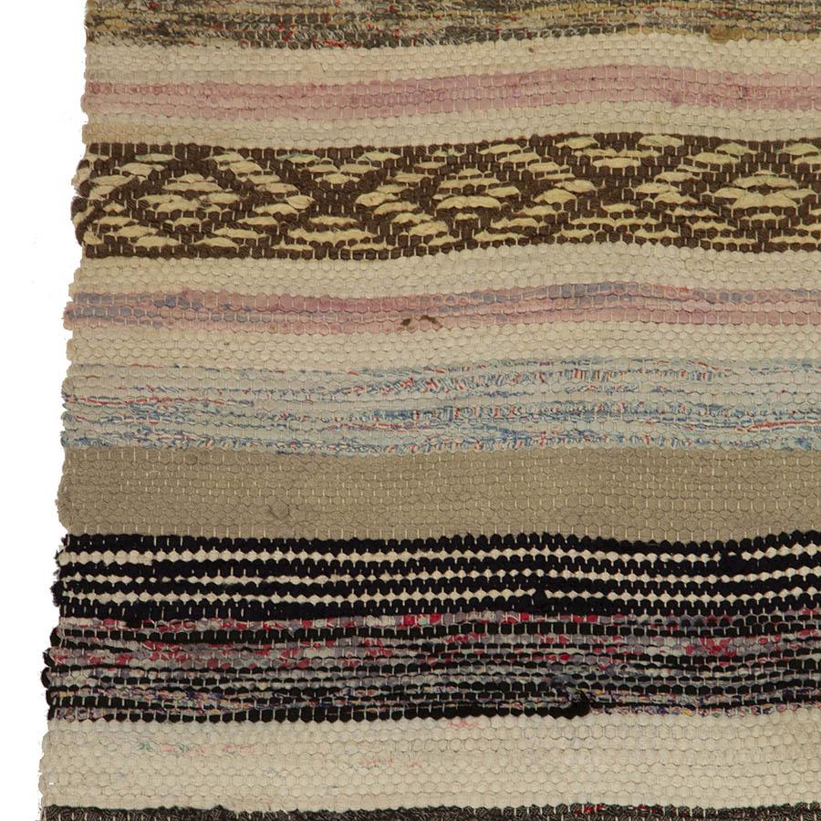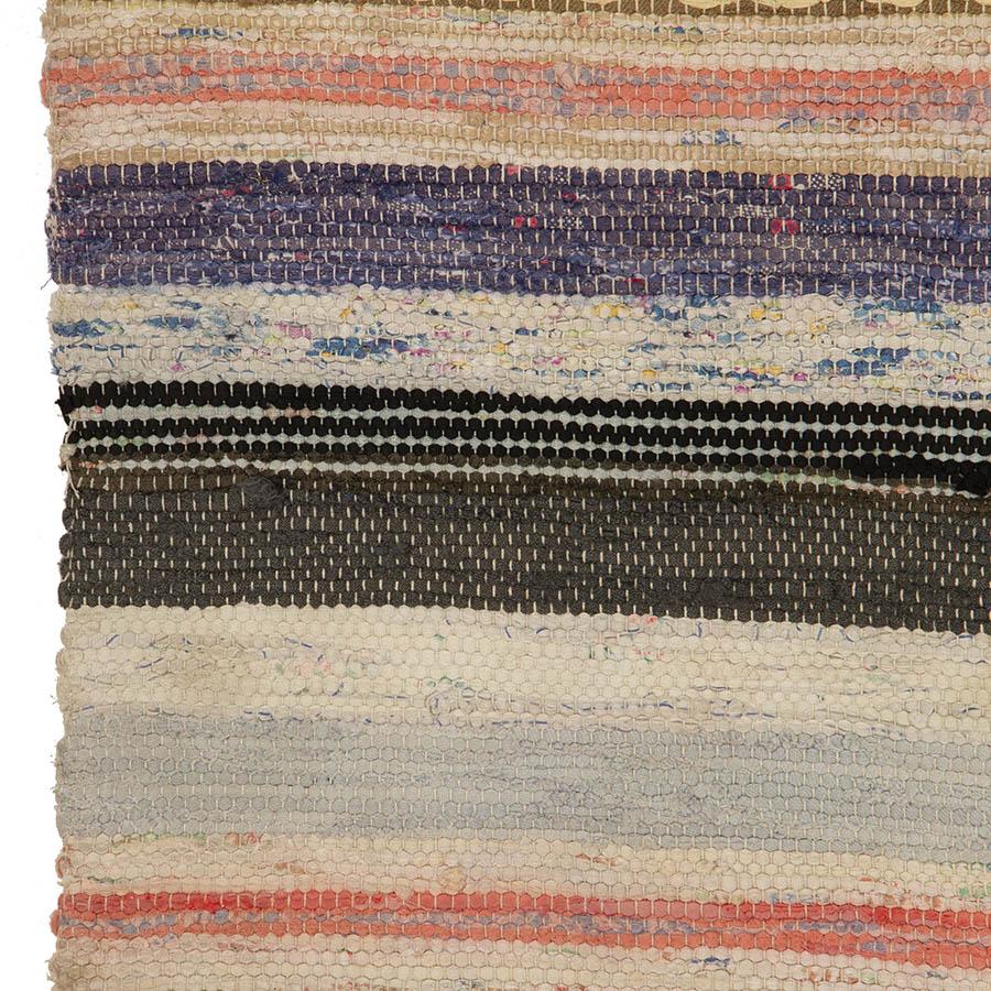 Swedish handwoven rug, circa 1940-50. This rug has a long and thin form, ideal for use as a runner. It features a densely striped design in attractive shades of blue, black, and pale green. Washable in cold water. RT6017439