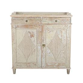 Large late 18th Century Swedish Gustavian buffet in original paint. With a galleried top, below two drawers, further below two doors. With decorative reeded diamonds, opening to useful storage. Circa 1790.