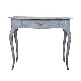 19th Century Swedish side table. On decorative cabriolet legs with a single drawer. Repainted in soft blue. Circa 1830.
