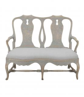 Small late 19th Century Swedish Rococo style sofa. Decoratively carved, repainted in soft blue. Ideal size for those hard to fill spaces; the end of a bed, alcove or landing.