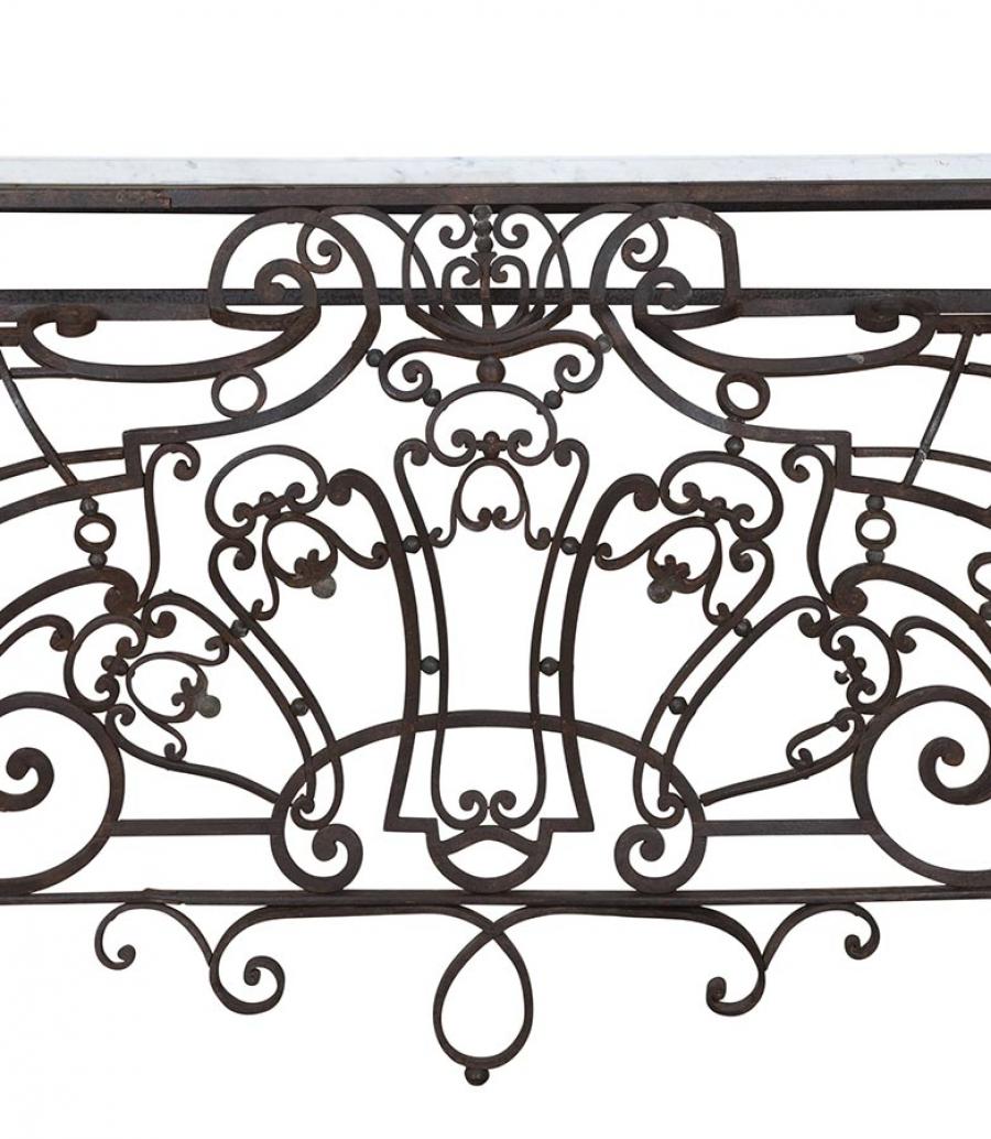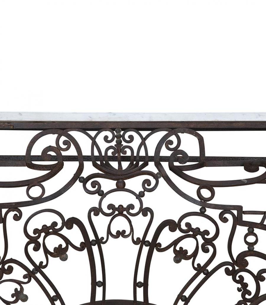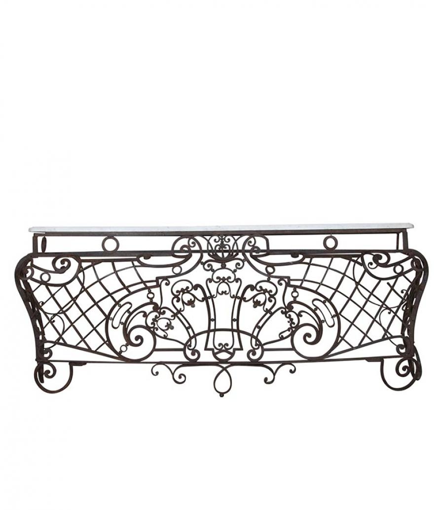 Exceptional large late 18th Century balcony console in hand forged iron work and marble top. Superb shape and patina, one of a kind piece that will make a room. Circa 1790.