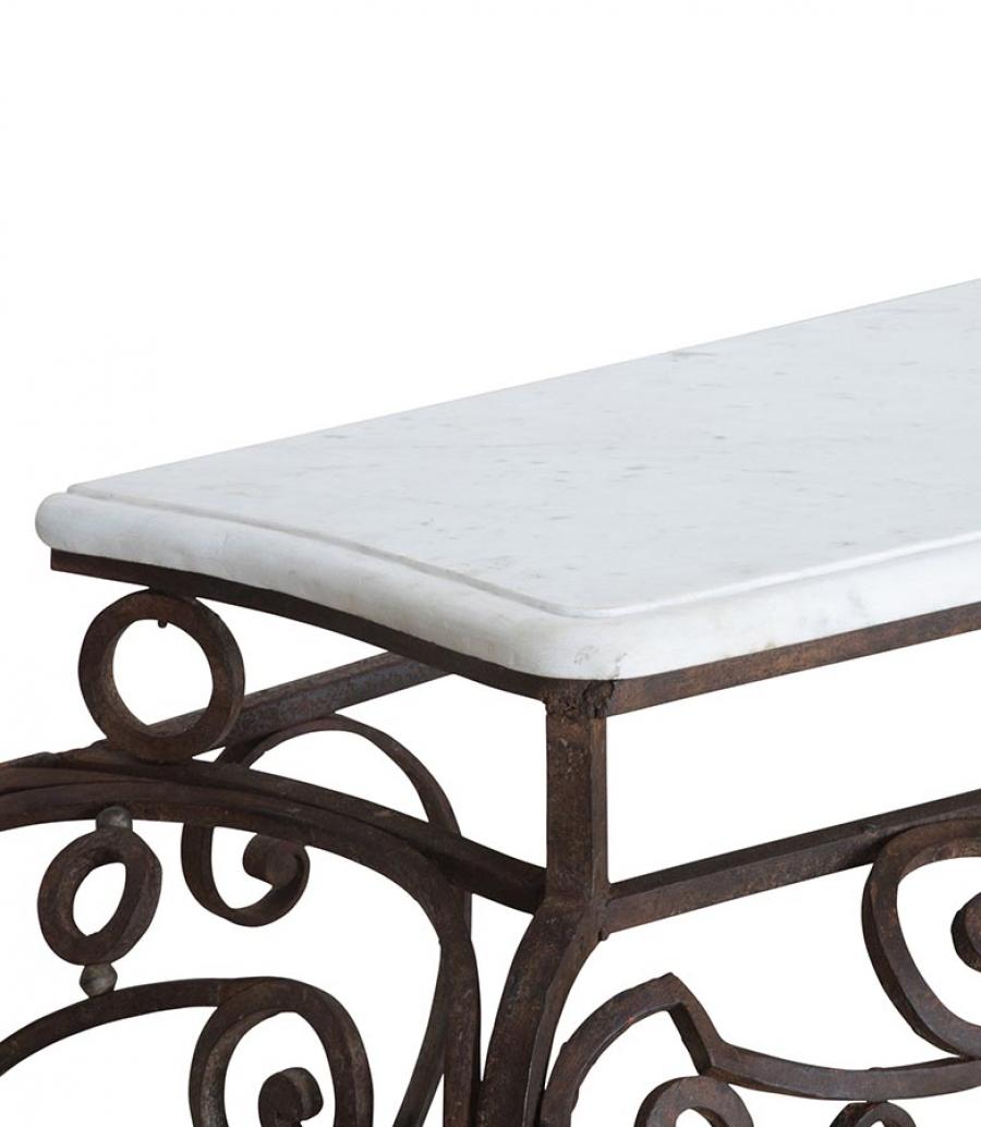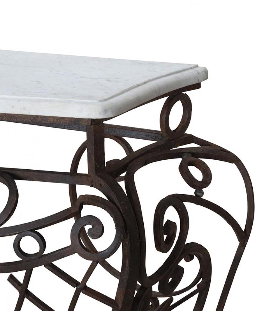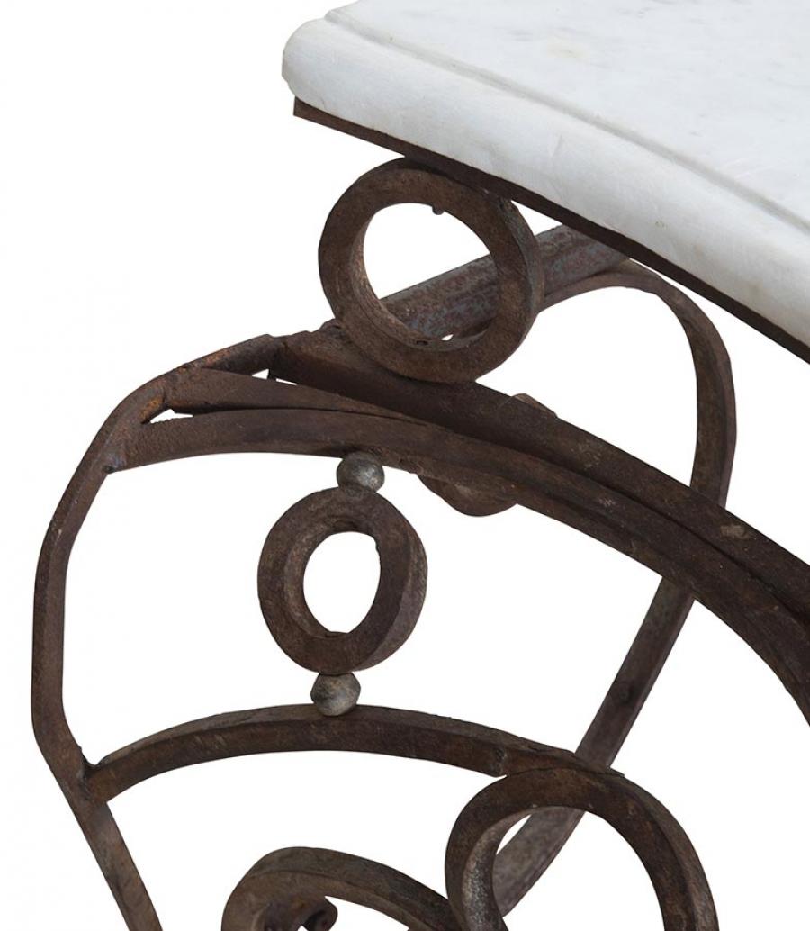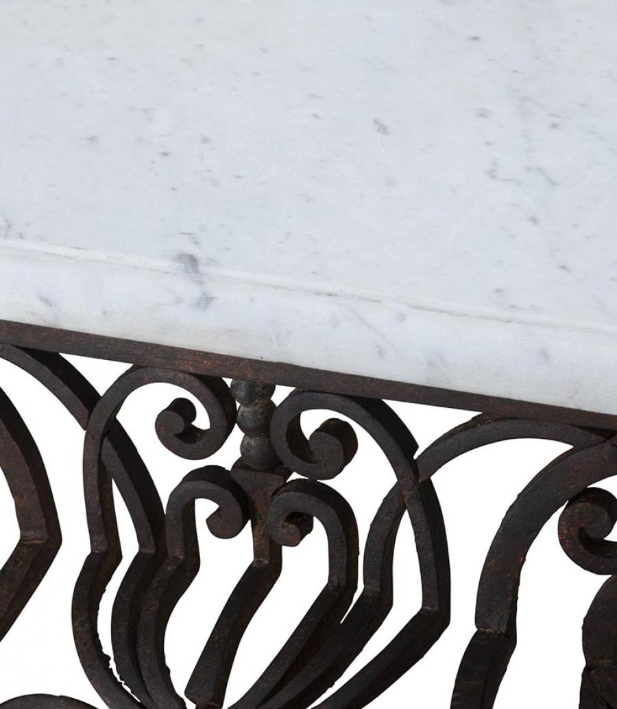 Exceptional large late 18th Century balcony console in hand forged iron work and marble top. Superb shape and patina, one of a kind piece that will make a room. Circa 1790.