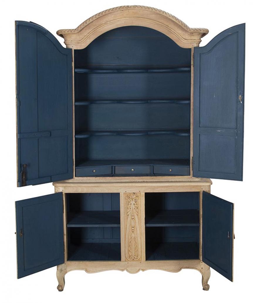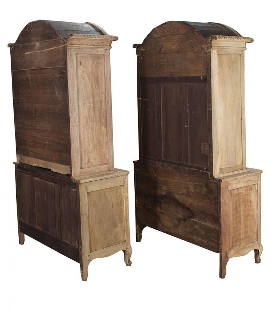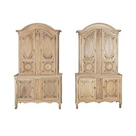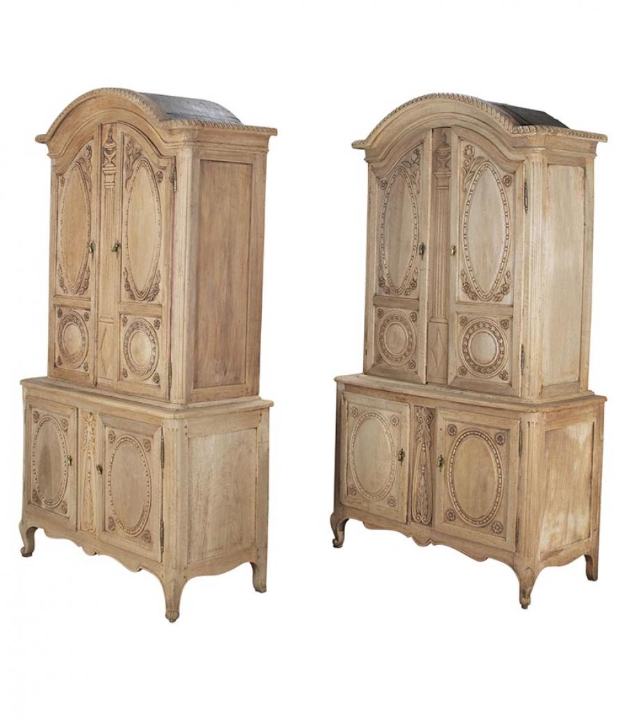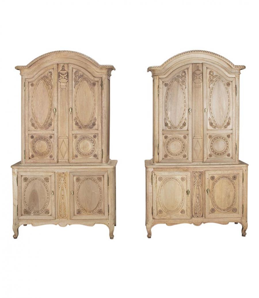 Pair of late 19th Century French bleached cabinets. Below the pediment, two doors with Neo-Classical carved detailings opening to useful storage. Below, two further carved doors. Bleached exteriors and repainted on the interior. Will separate into two parts for ease of transportation and delivery. Circa 1890.