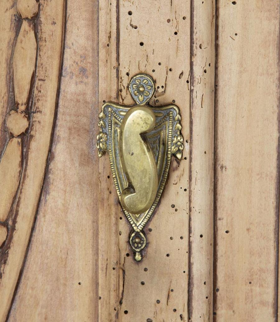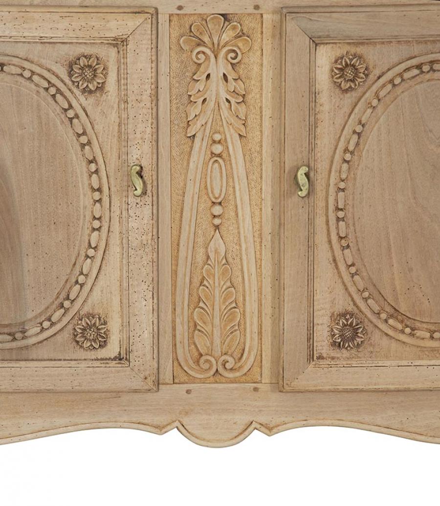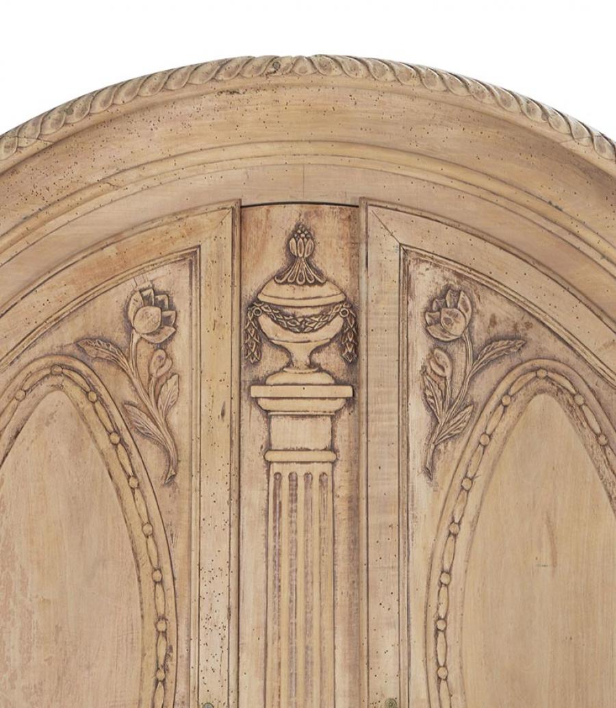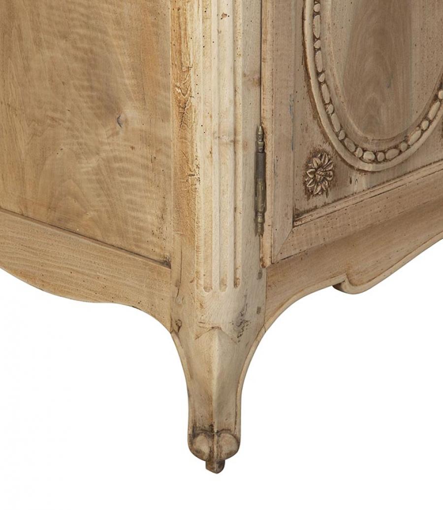 Pair of late 19th Century French bleached cabinets. Below the pediment, two doors with Neo-Classical carved detailings opening to useful storage. Below, two further carved doors. Bleached exteriors and repainted on the interior. Will separate into two parts for ease of transportation and delivery. Circa 1890.