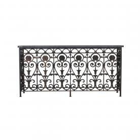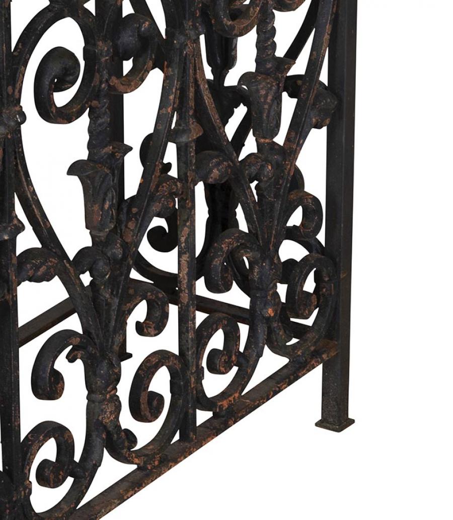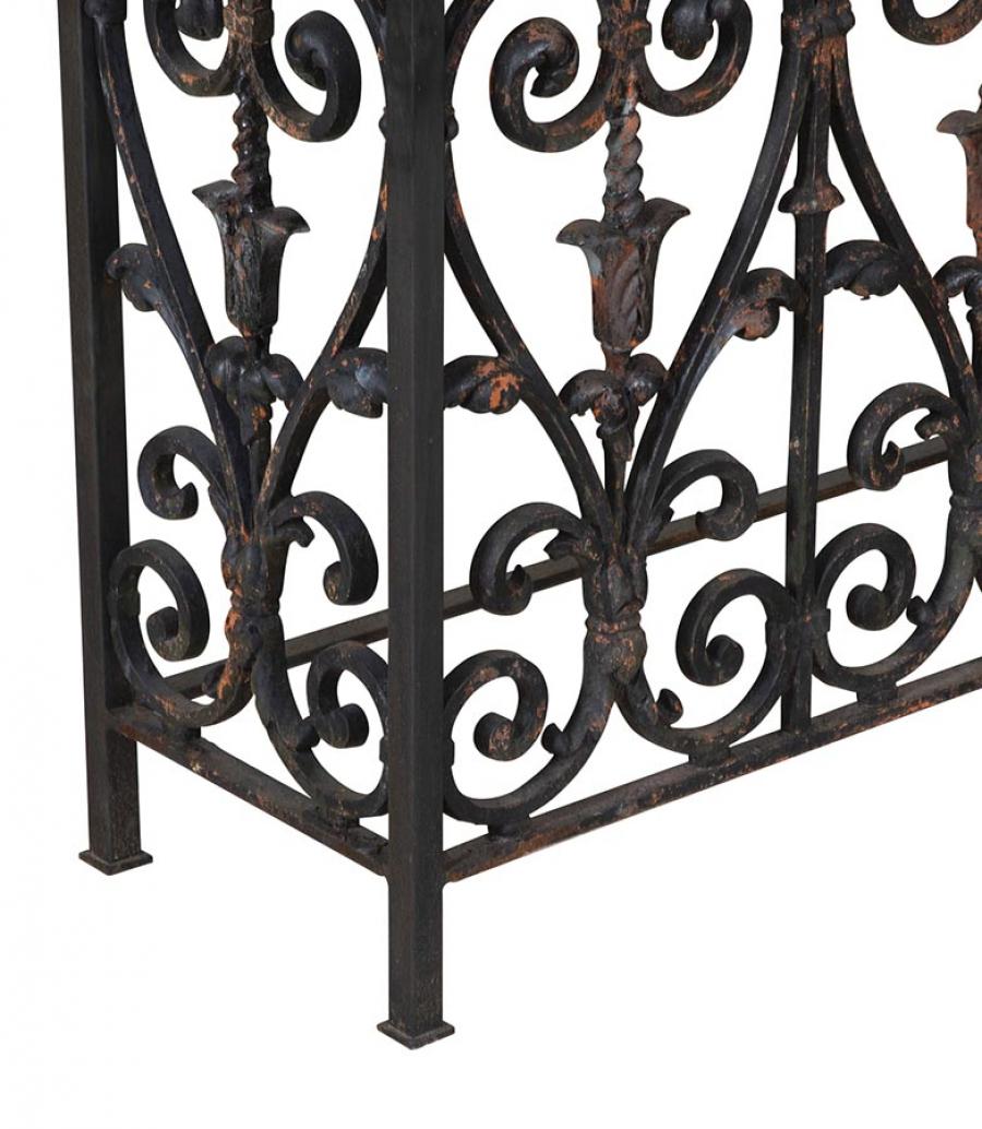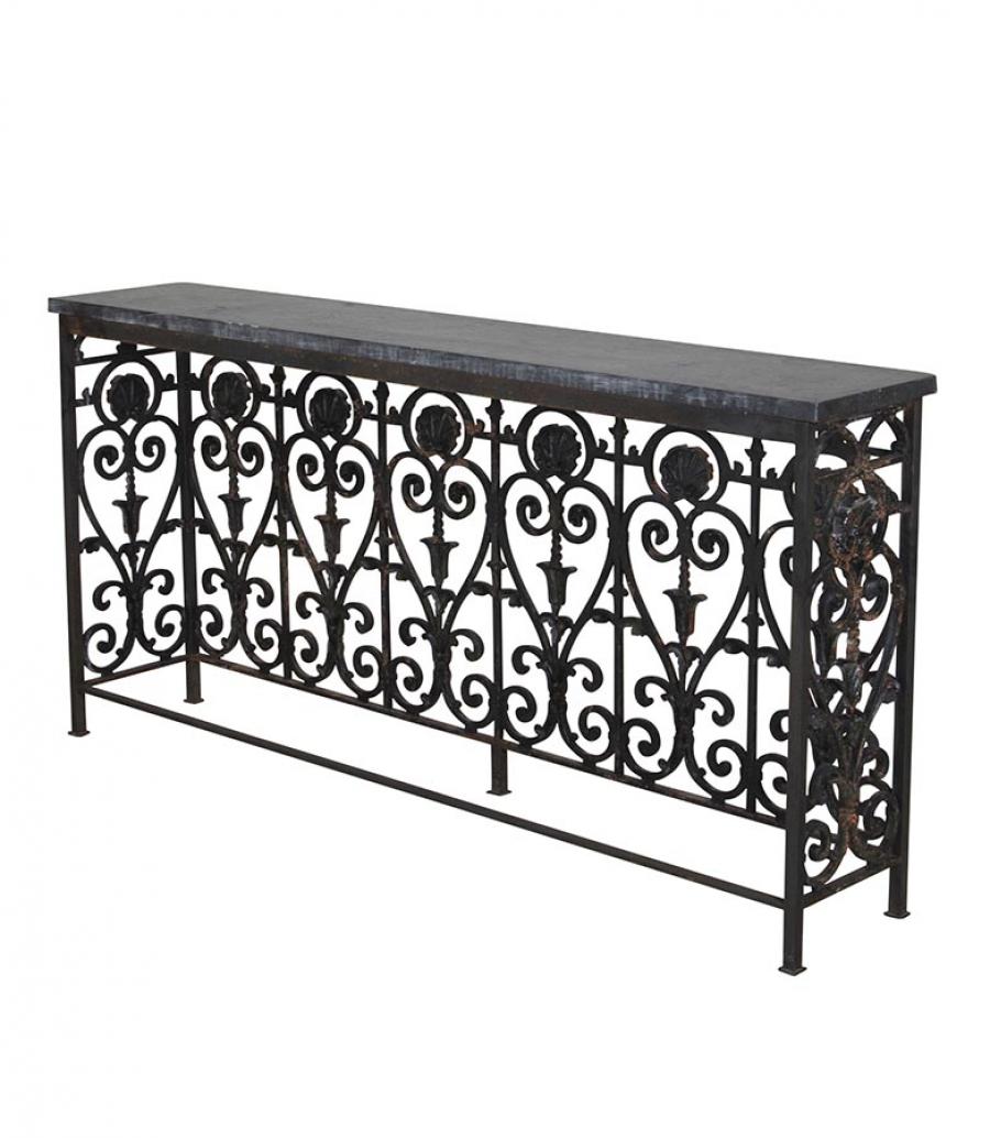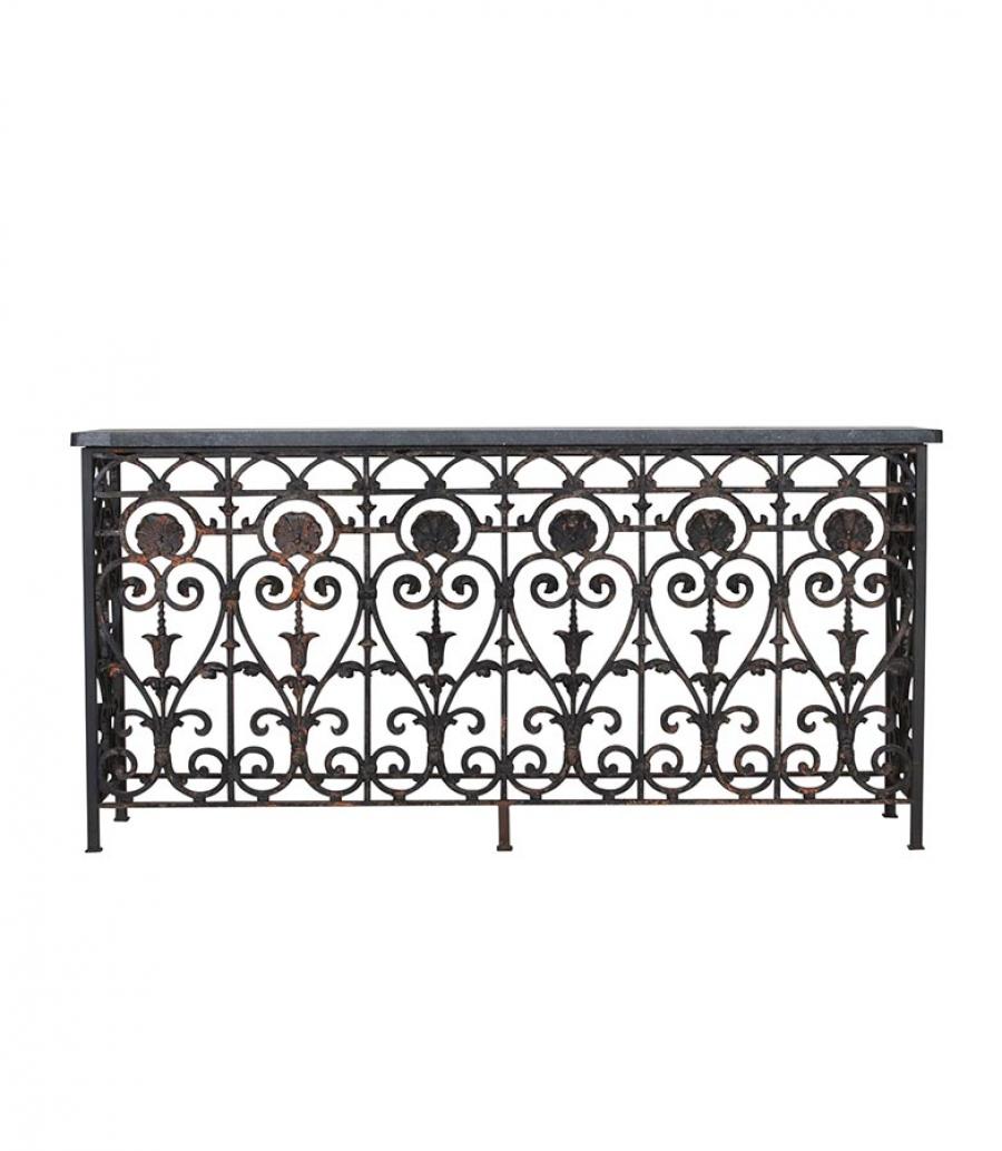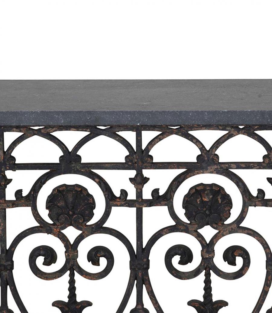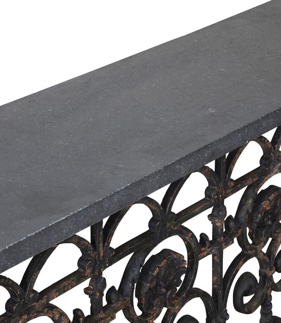 19th Century French cast iron balcony. Excellent workmanship, with scroll and shell design and a time worn patina. Belgium blue slate top, ideal narrow consoles for a hallway, landing or over a radiator. One of two consoles available, priced individually.