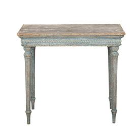 Well carved 18th Century Swedish Gustavian console. Decorative carved detailing around three sides, carved and turned legs and repainted in soft blue. Circa 1780.