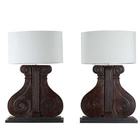 Large pair of 19th Century Italian carved wooden lamps made from architectural walnut fragments. Circa 1840. Rewired and PAT tested to UK standards.