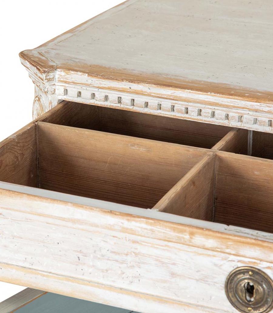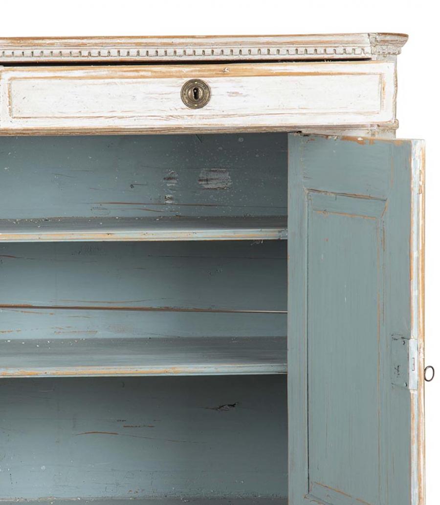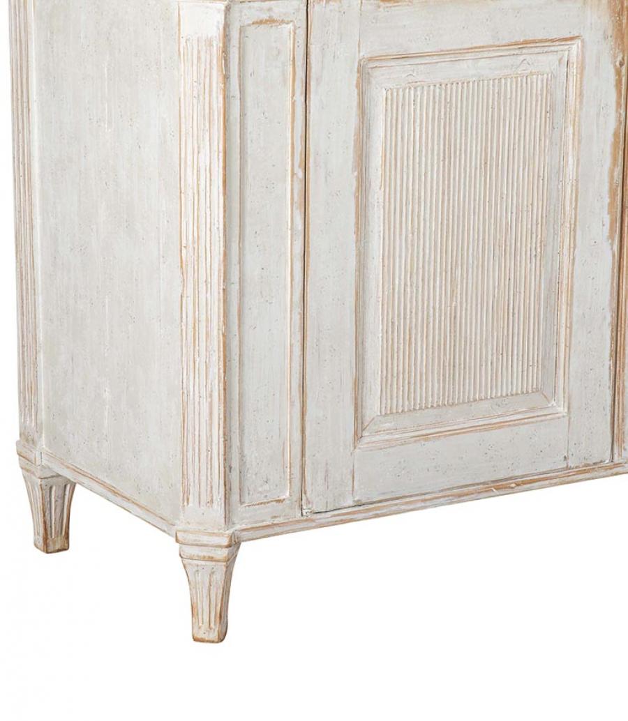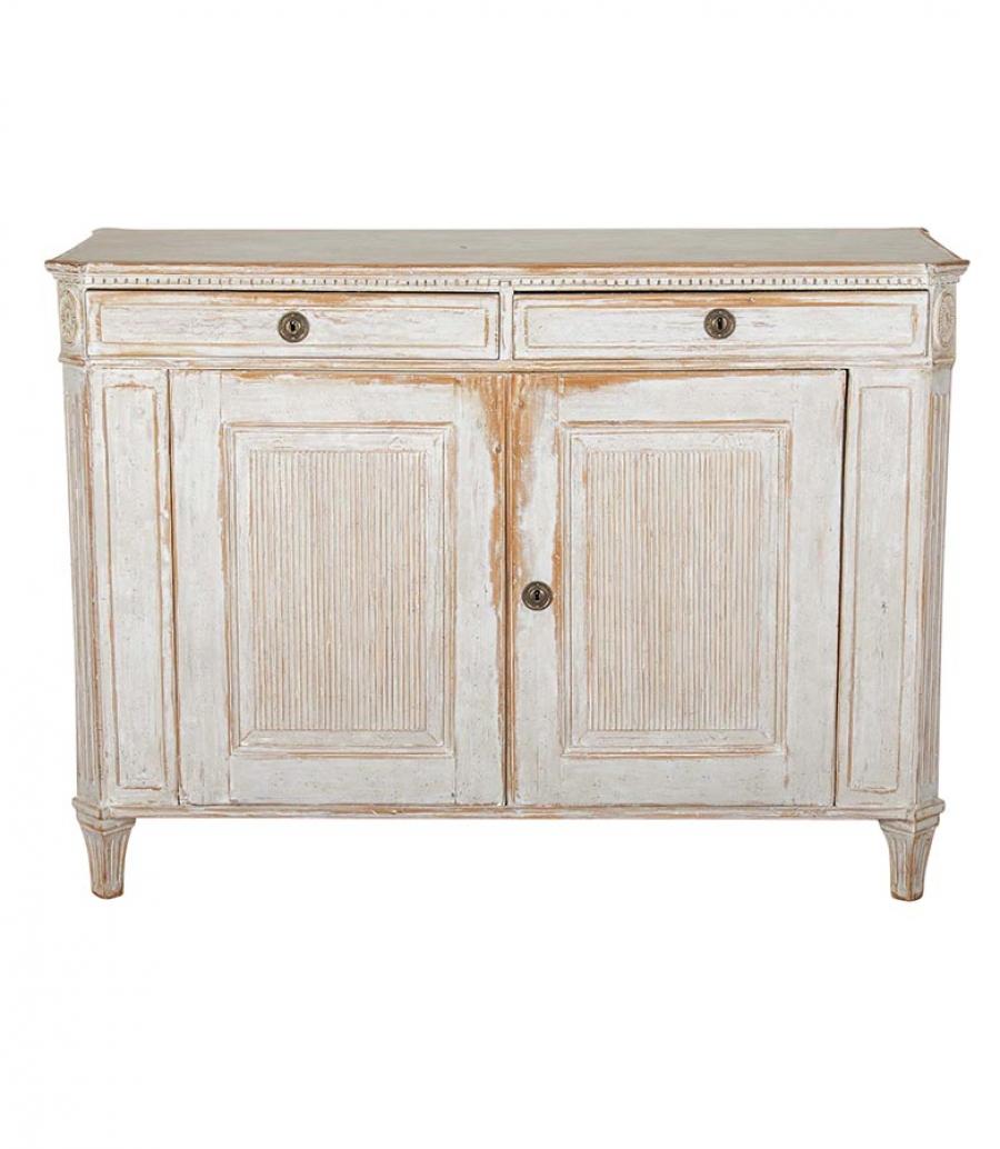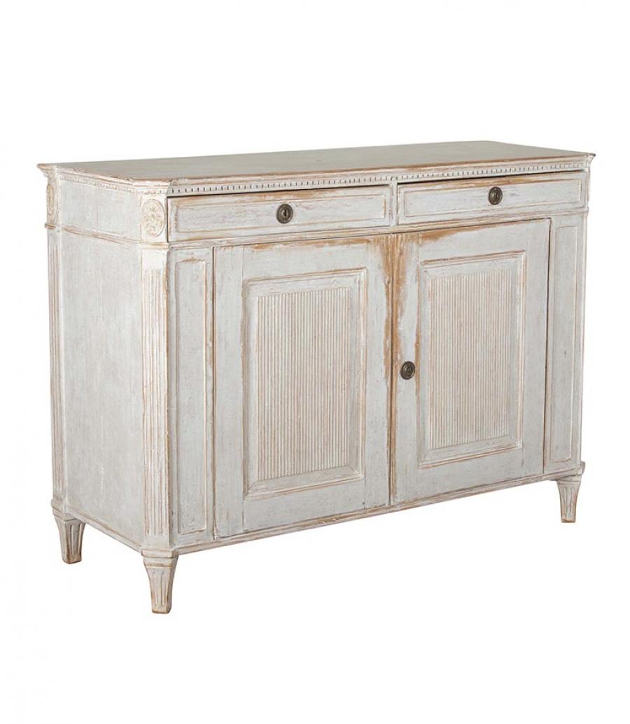 18th Century Gustavian buffet, or large enough to use as a server. With two doors with carved reeded detailing, opening to useful storage. Repainted in soft grey.